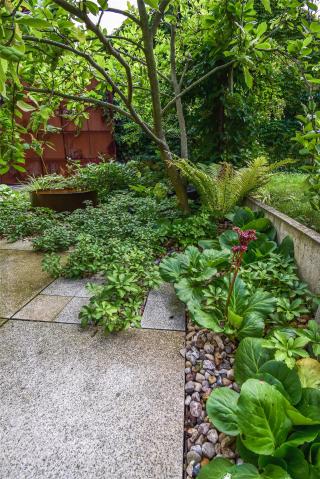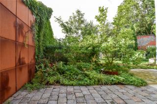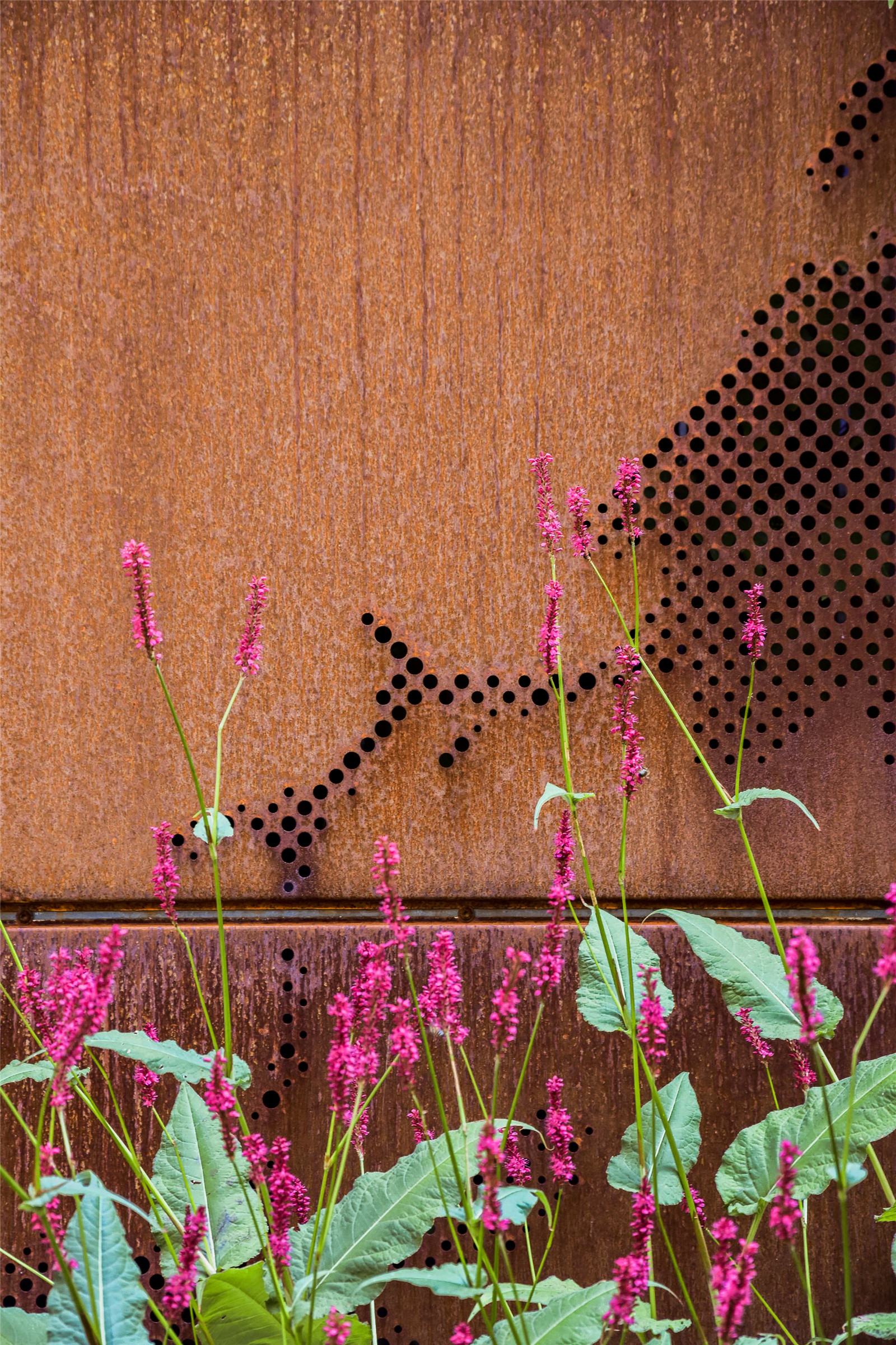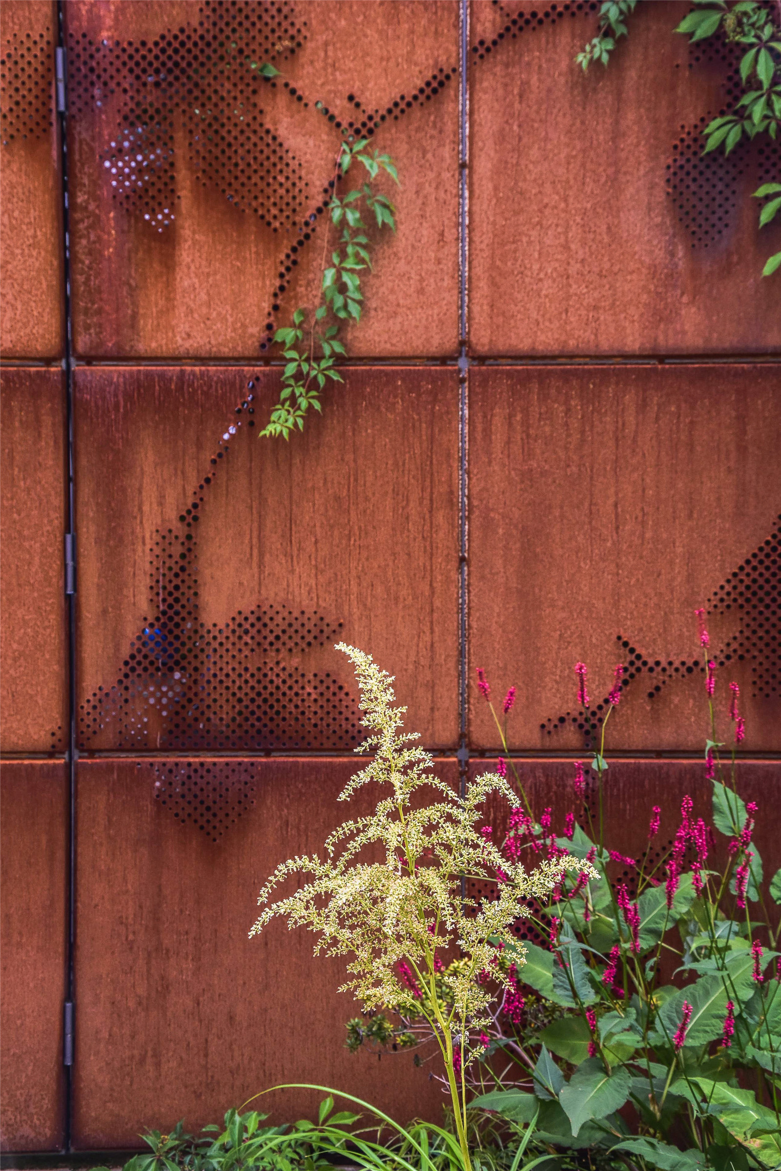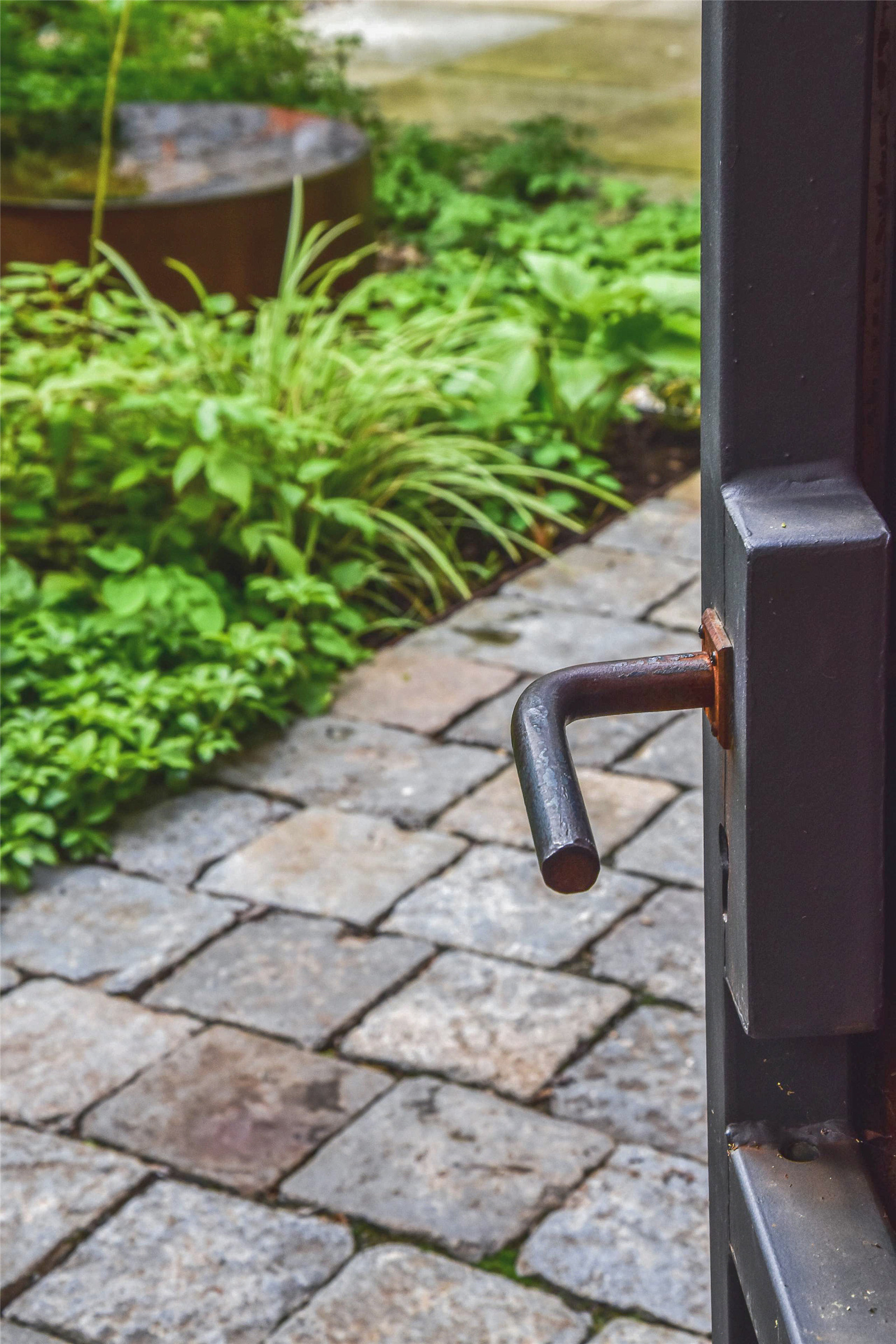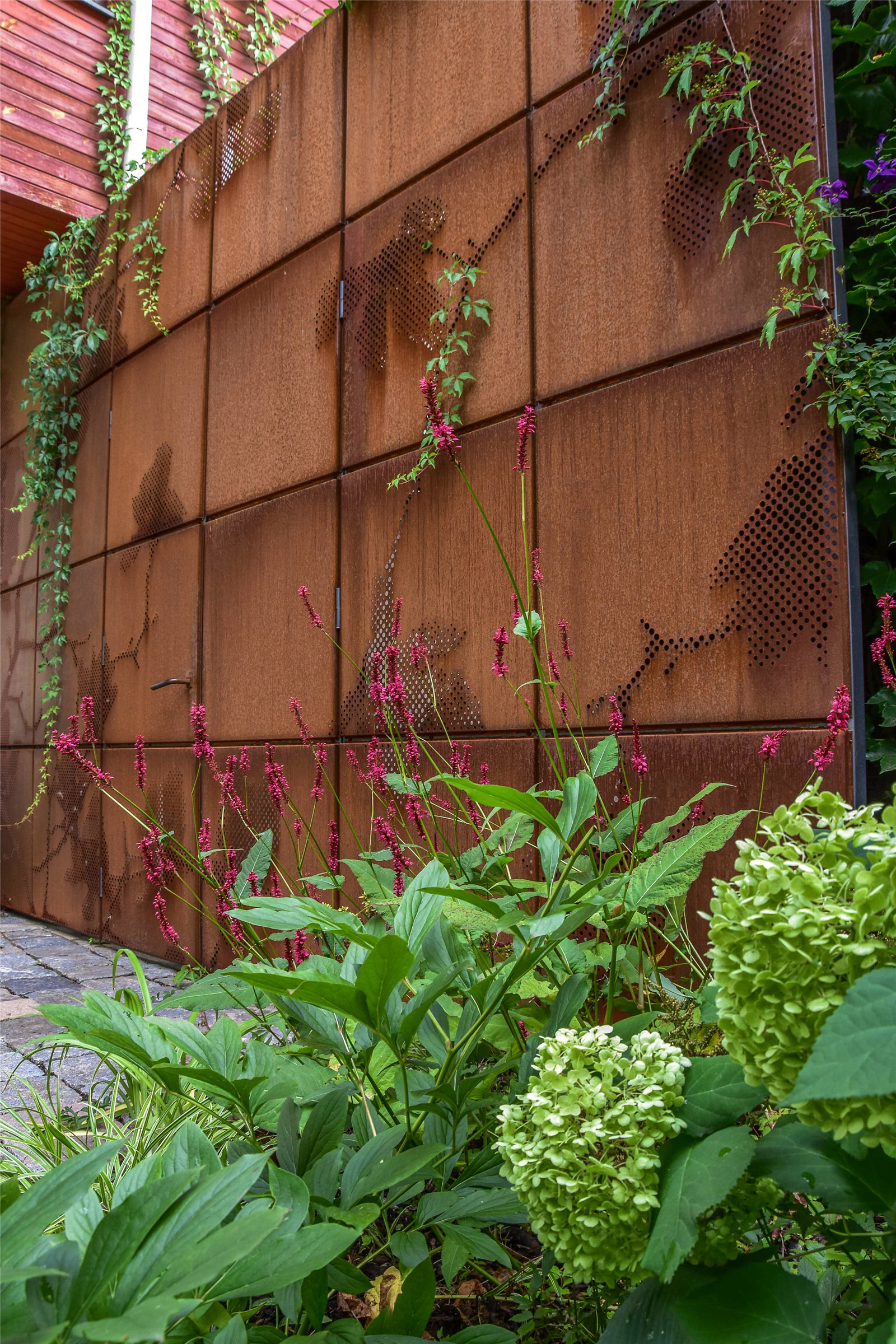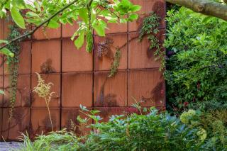 這些布滿鐵銹的金屬材料被富貴草、箱根草和羽衣草的葉片所包圍,五葉地錦正沿著鐵門攀緣生長?;ǔ刂欣C球和芍藥全年交替開放。大蒜的小花、忍冬、蟲蛹、銀蓮花和小蠕蟲讓庭院一年四季都充滿樂趣。冬天金屬微微閃著紅色的微光,讓庭院充滿活力。