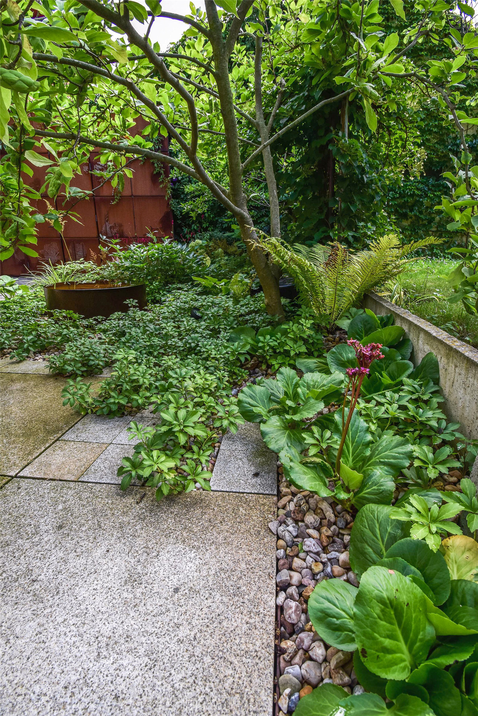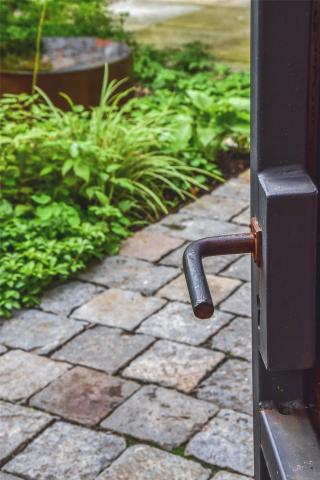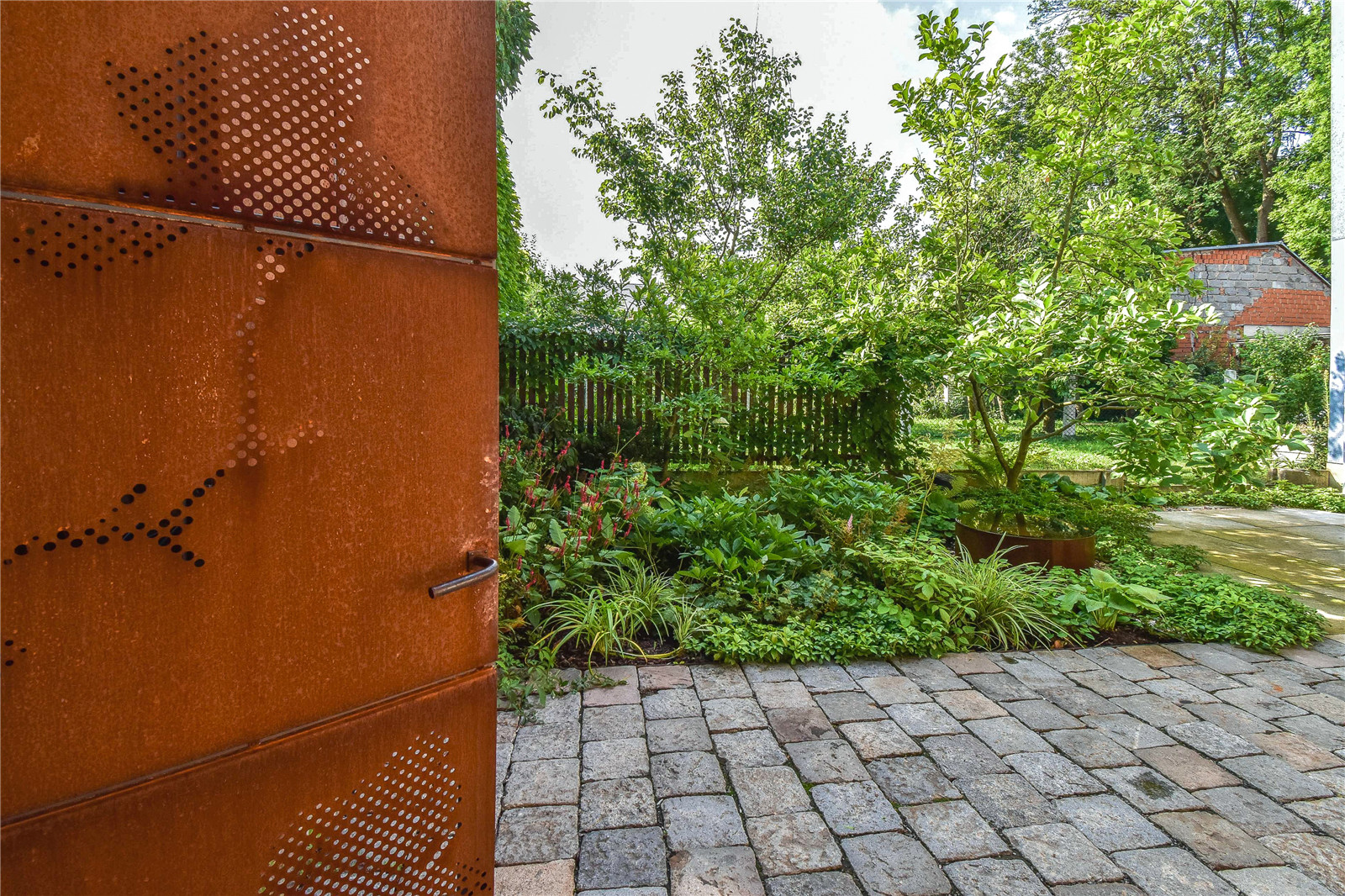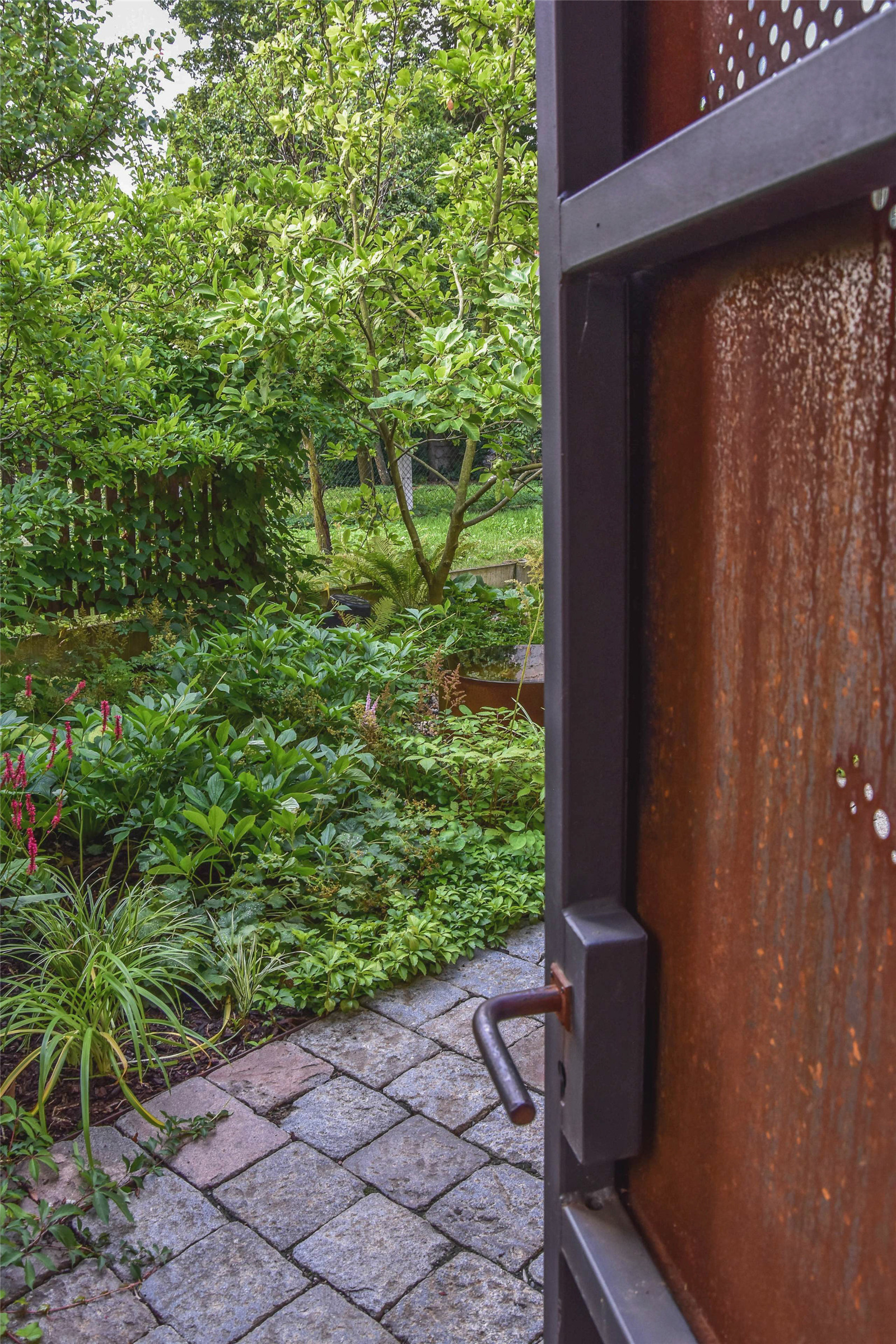 The metal elements, even with all the rust, are immersed in the leaves of pachysandra, Hakone grass and the Lady’s mantle, the gate is slowly climbed by the Virginia creeper. Hydrangea and Peony flowers shine in the flowerbeds during the year. Tiny flowers of garlic, honeysuckle, pupae, anemone and flatworm guarantee that there is something to enjoy all year round. Even during the winter, the color of the metal glows here and colors the atrium with an unexpected vibrant red.