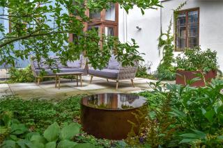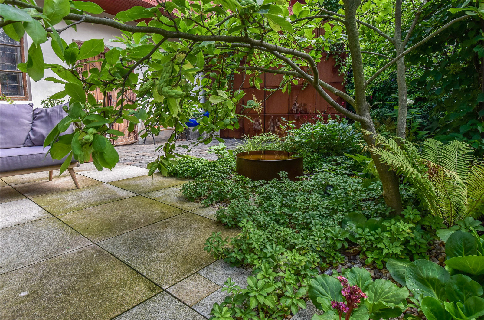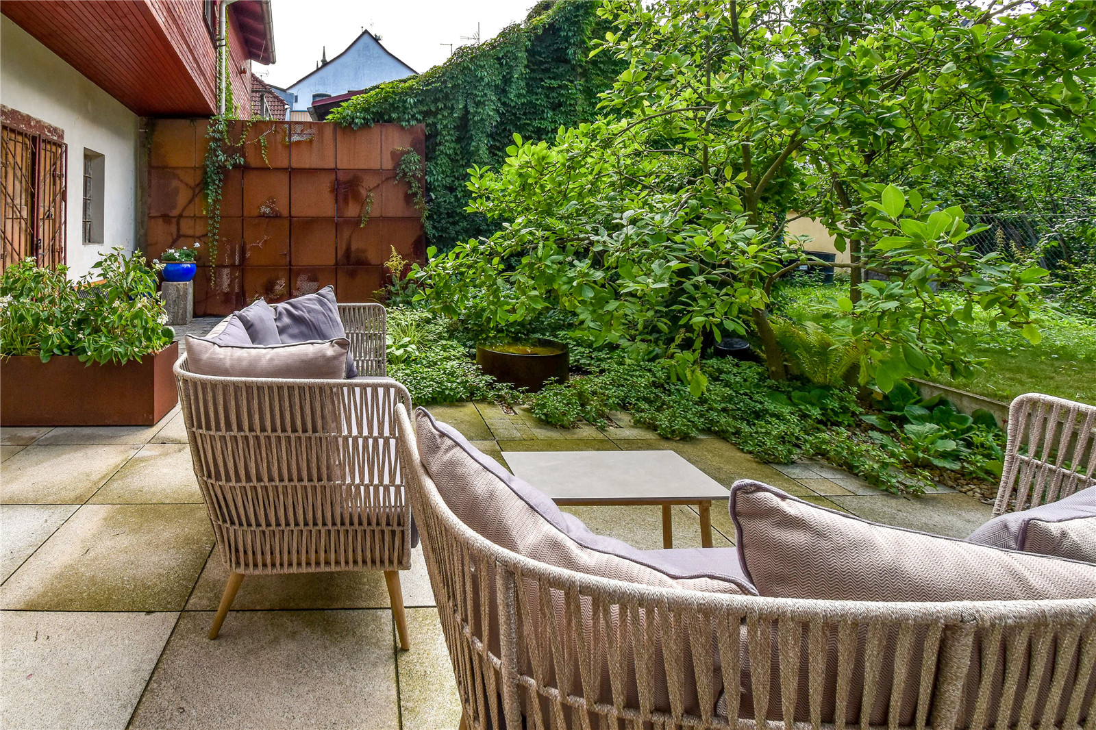 The rusty element of the steel wall, sculpturally refined by a natural motif, is complemented by a water element, a corten bowl in a shady flower bed under the old tree, and a few boxes of flower-pots of the same material in the back of the seating.