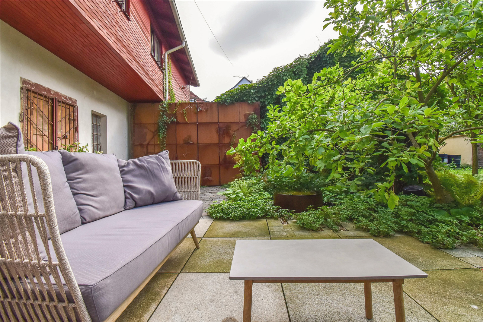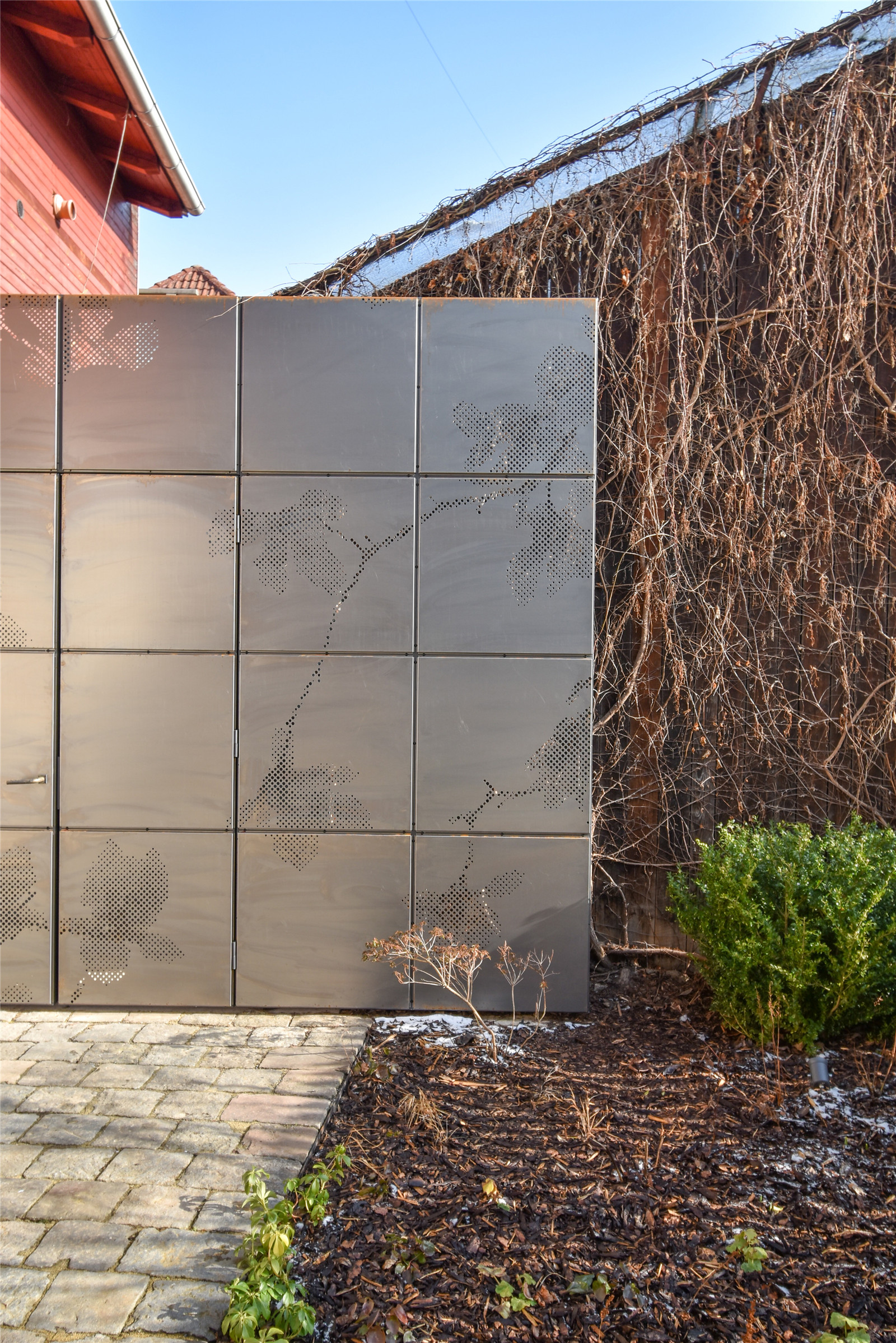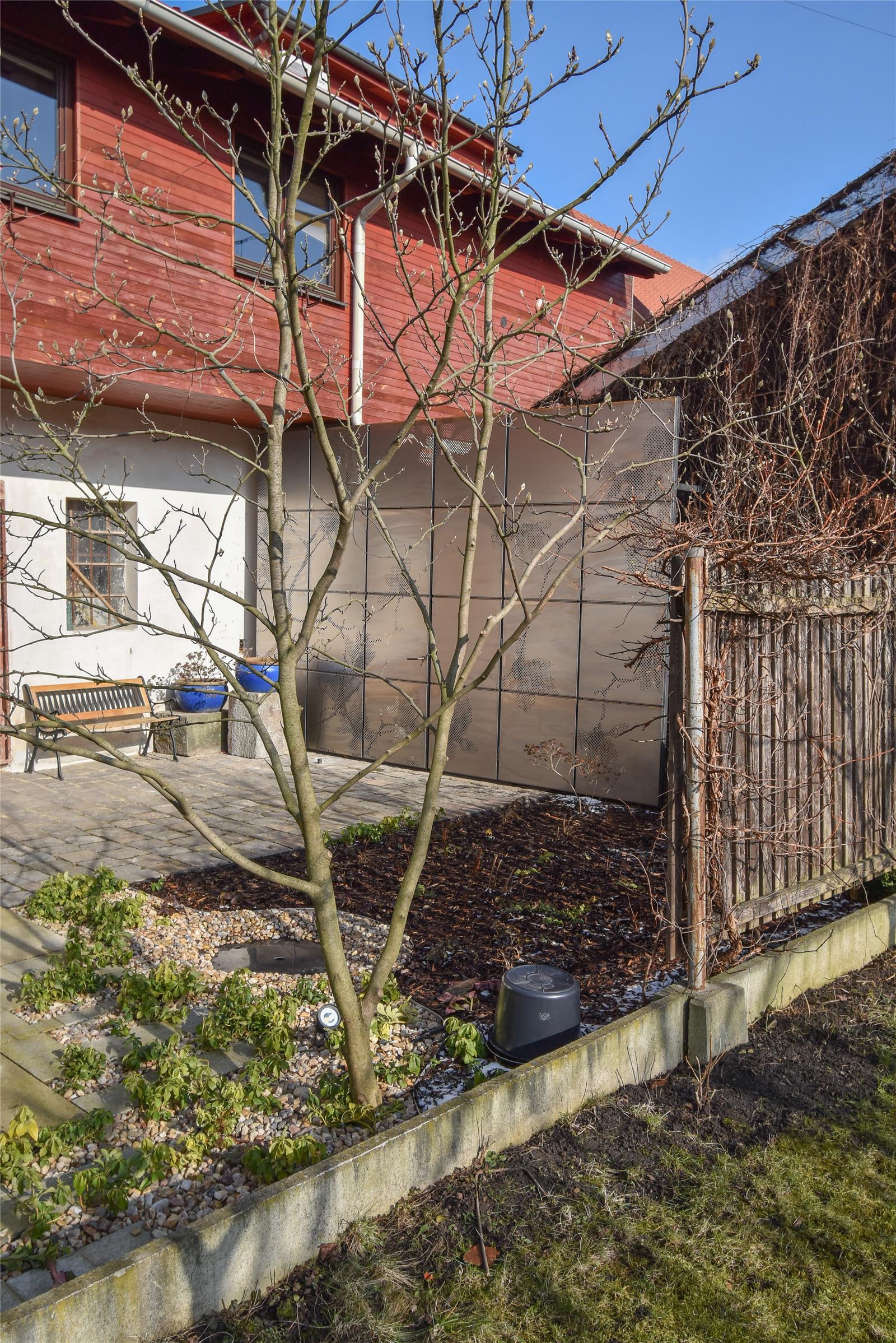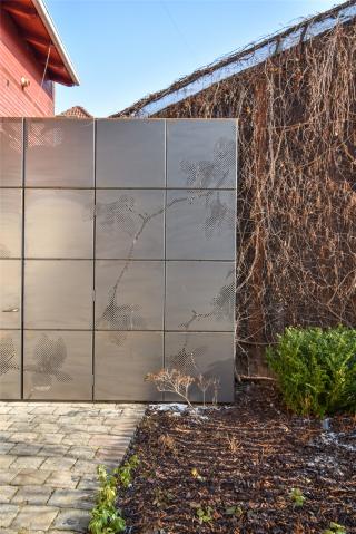 Surprisingly, the main element of the small atrium is not the garden furniture or greenery, but the metal gate. The whole wall of the courtyard is formed as a rusty sheet metal screen with an entrance (need to drive in!), into which a perforation in the shape of a flowering branch of the magnolia was graphically imprinted. It’s like a photographic plate getting patina, capturing a moment which does not exist anymore. It creates a backdrop for the yard and functions as a semi permeable shielding from the buzz of the storage and shops. It allows people to pass through - children running to school, workers catching a smoke break, or regular visitors dropping by to say hello.
