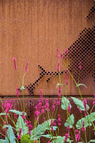 讓銹蝕鐵墻更顯精致的除了自然的雕刻圖案外,還有精巧的水景。在老樹的樹蔭下,花壇中藏著一個由耐候鋼制成的碗狀水景,座椅的后方也有幾個同樣材料制成的花箱。