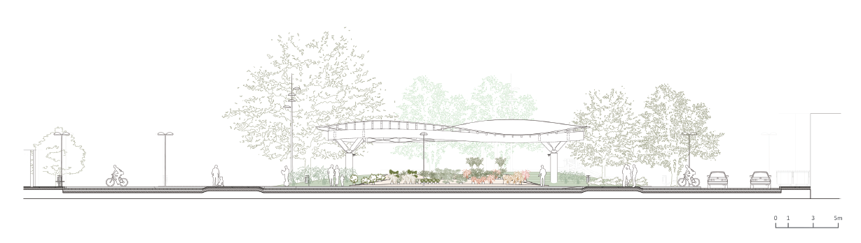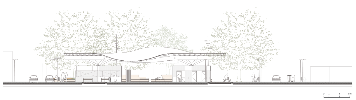 Natureza Urbana提出了一個倡導(dǎo)團(tuán)結(jié)、組織以及更好的利用現(xiàn)有空間的方案,幫助小吃攤、報亭以及出租車??空镜染哂械胤教厣脑O(shè)施融入環(huán)境。場地原為一塊缺少綠化的巨大水泥廣場,經(jīng)過改造后,廣場擁有了鋪滿草坪的斜坡,綠化面積顯著增加,此外還新建了石質(zhì)的看臺座椅和花店區(qū),為前往公墓的人們提供了更多的建筑設(shè)施。屋頂結(jié)構(gòu)由多層薄木板粘連在一起構(gòu)成,木材來自再造林地。屋頂以及其余空間都有一種流動的美感,讓人想起倫索伊斯?馬拉年塞斯國家公園(Len?óis Maranhenses)里的沙丘。