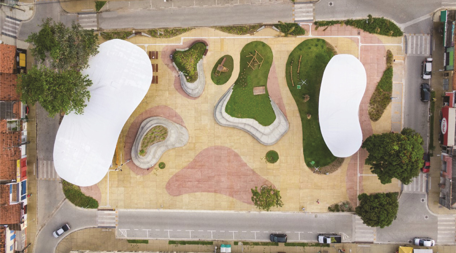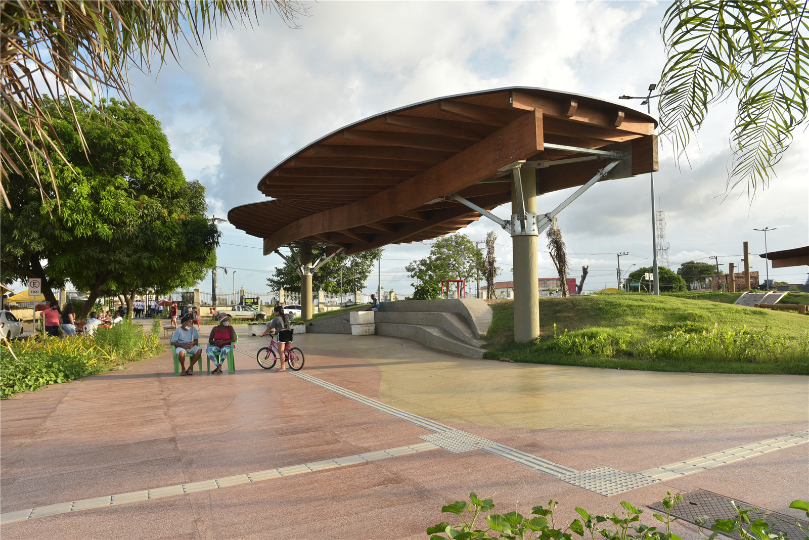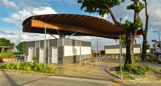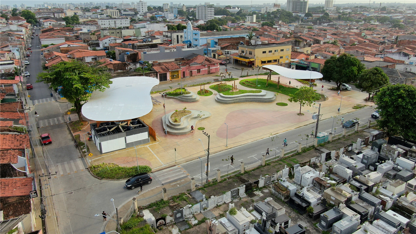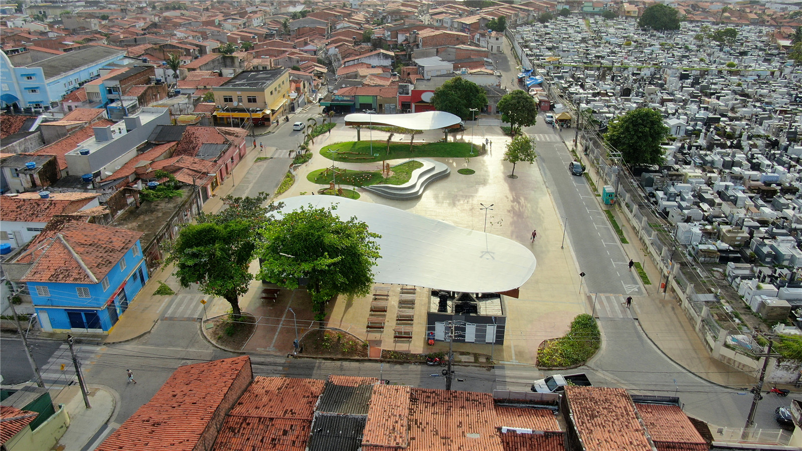 Natureza Urbana proposed a project that provides unity, organization and a better use of the existing free area, in addition to enabling the integration of local equipment such as food stalls, magazines stalls and taxi stops. Previously characterized by a large cemented area and a lack of green, the square gained grass mounds to expand the vegetation, masonry bleachers and new space for florists, who now serve the cemetery visitors with more structure. The roofs are made of glued laminated wood from reforestation. Both the roofing elements and the rest of the space have a fluid aesthetic, in reference to the Len?óis Maranhenses’ sand dunes.