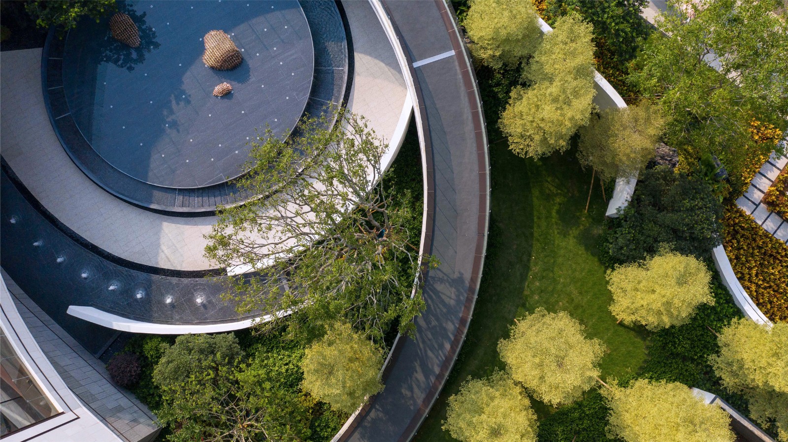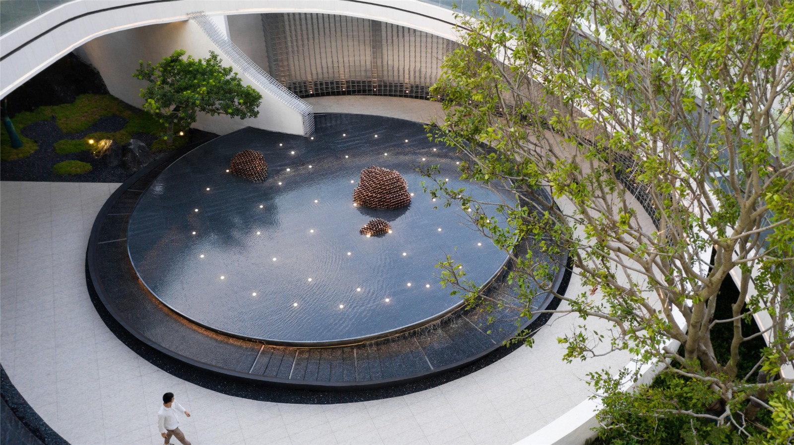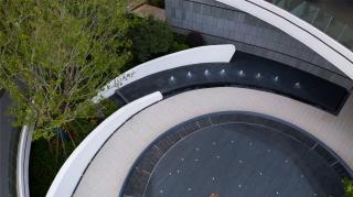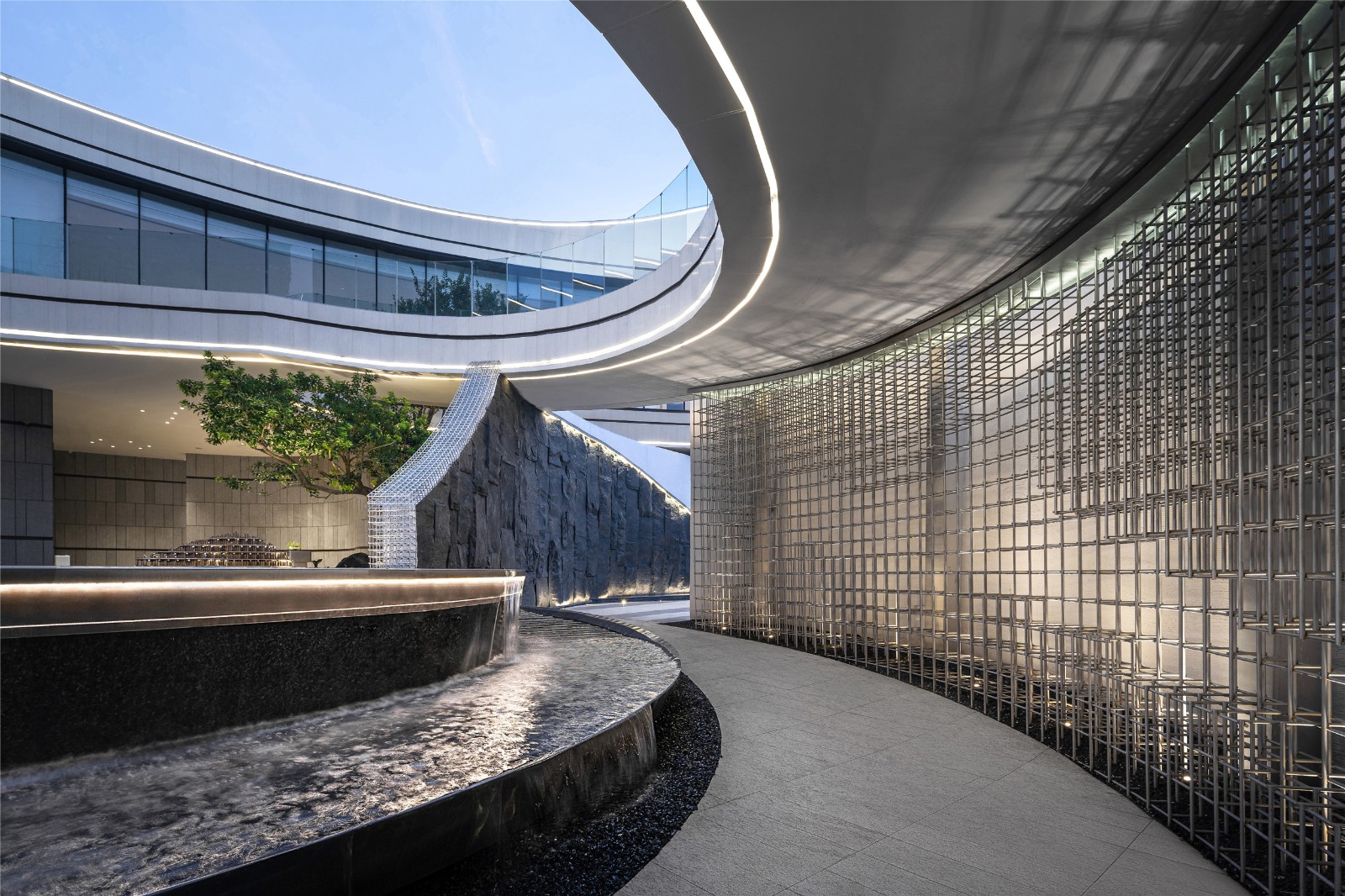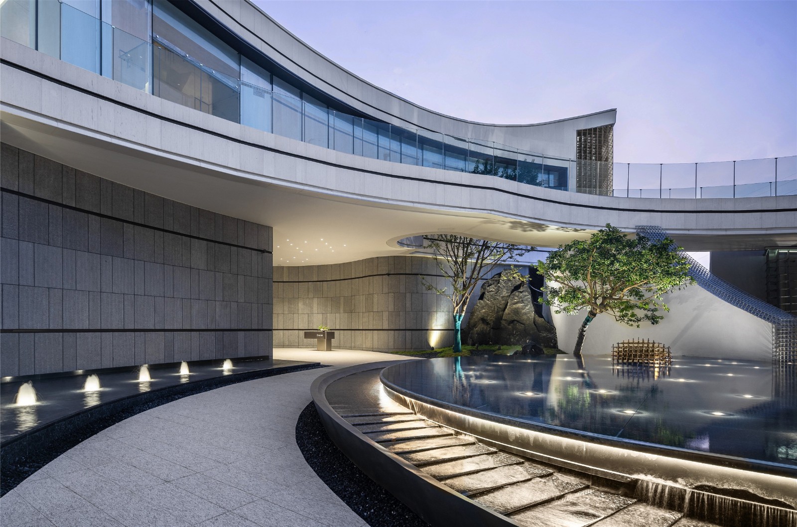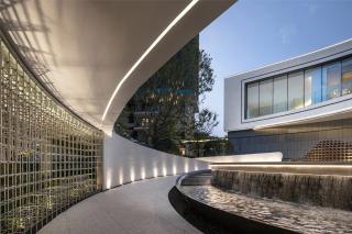 棱角分明的格柵墻與圓弧形的島中湖相互輝映