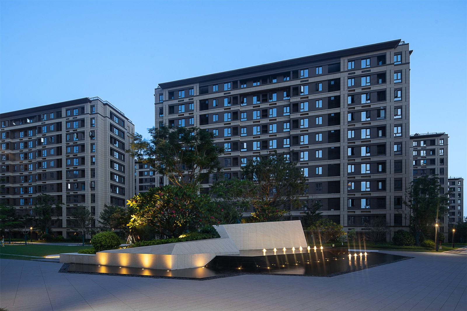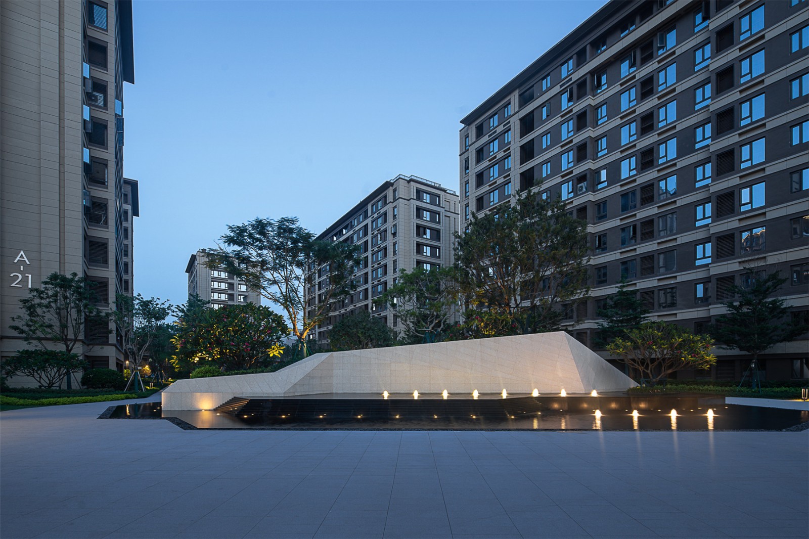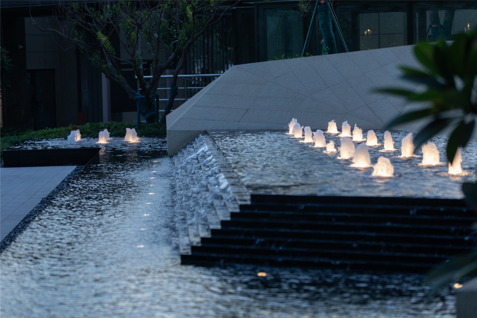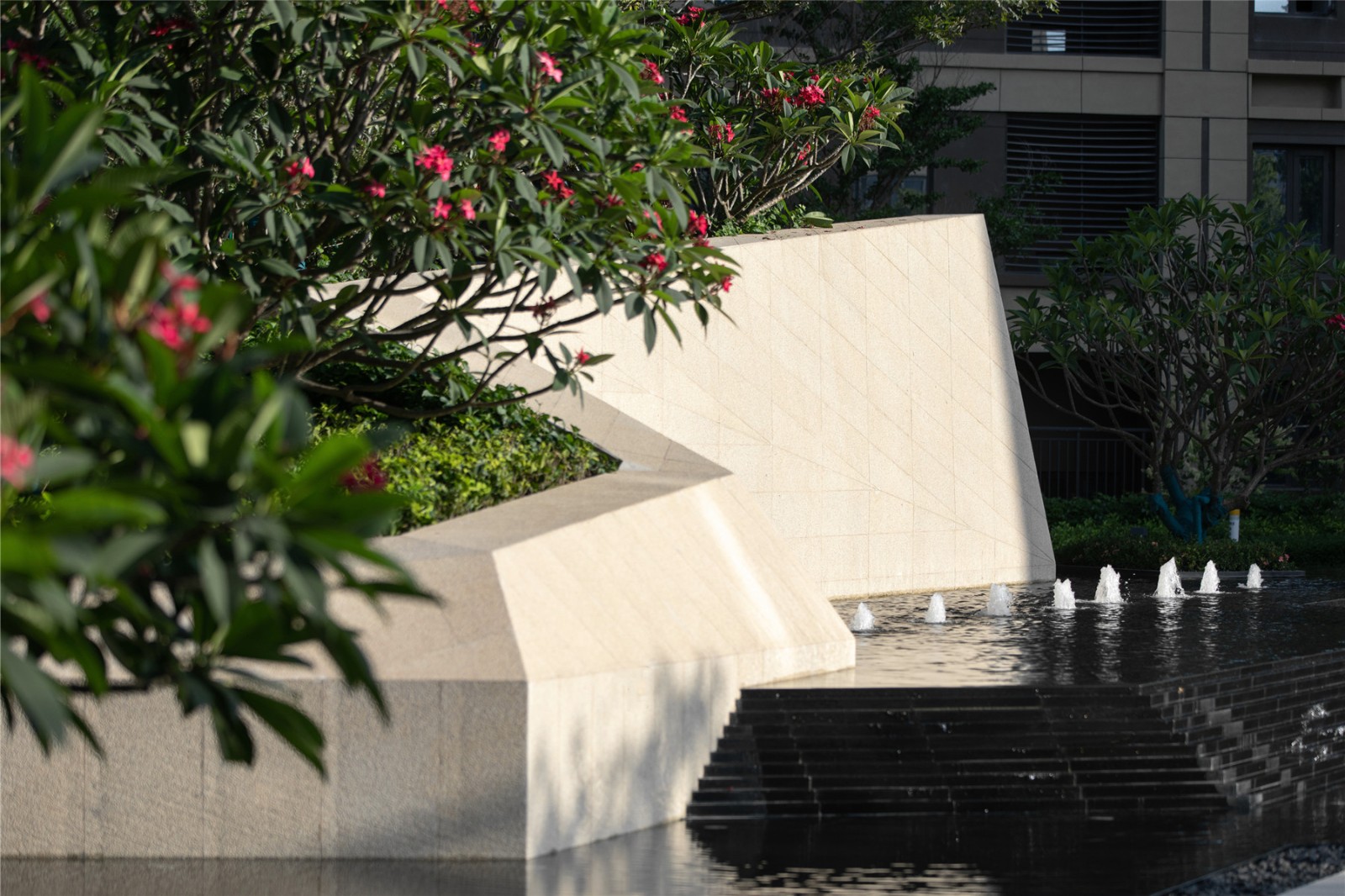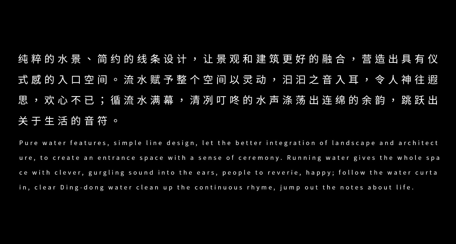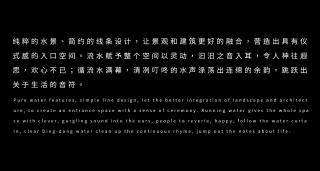 Pure water features, simple line design, let the better integration of landscape and architecture, to create an entrance space with a sense of ceremony. Running water gives the whole space with clever, gurgling sound into the ears, people to reverie, happy; follow the water curtain, clear Ding-dong water clean up the continuous rhyme, jump out the notes about life.