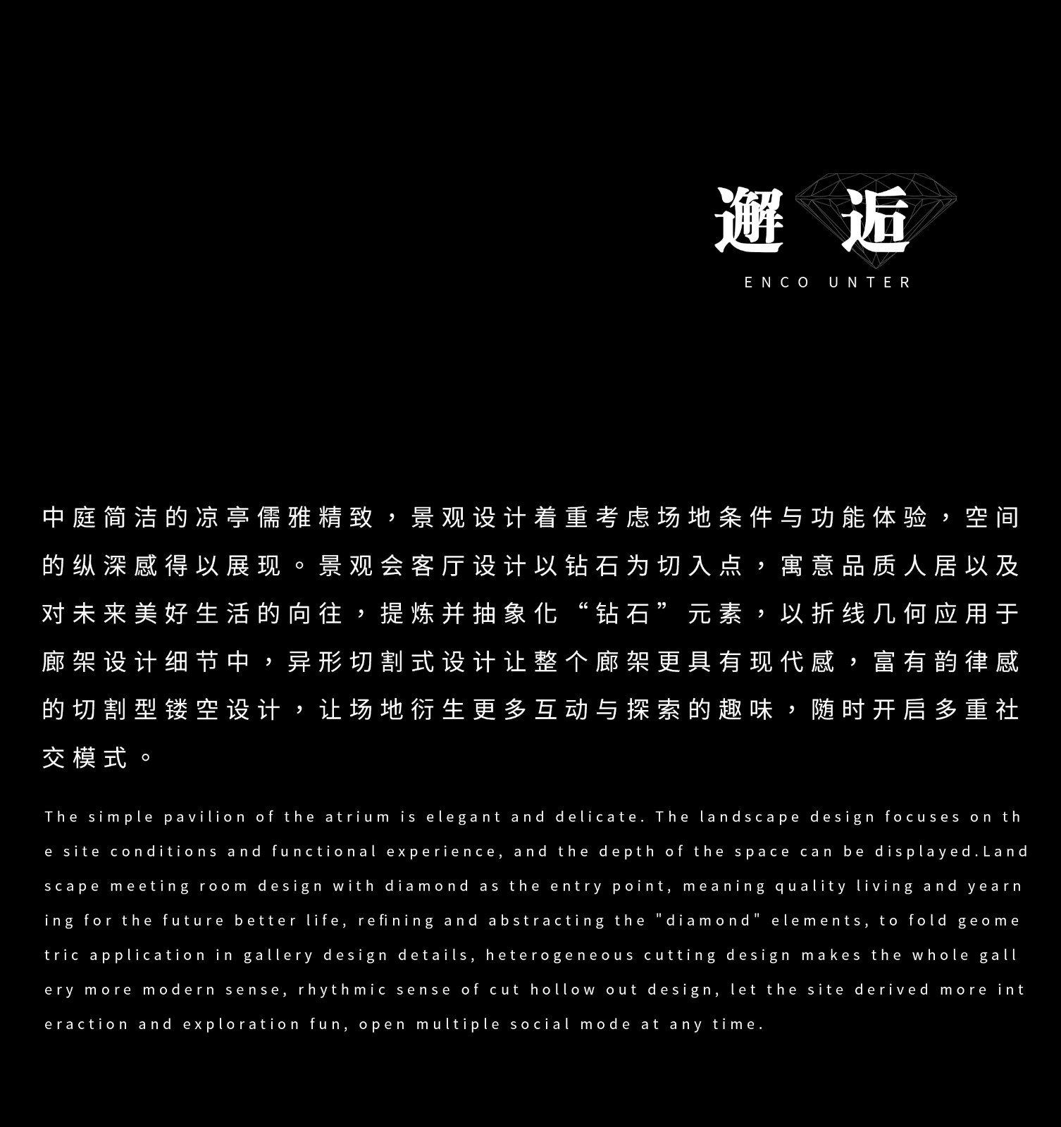 Landscape meeting room design with diamond as the entry point, meaning quality living and yearning for the future better life, refining and abstracting the "diamond" elements, to fold geometric application in gallery design details, heterogeneous cutting design makes the whole gallery more modern sense, rhythmic sense of cut hollow out design, let the site derived more interaction and exploration fun, open multiple social mode at any time.