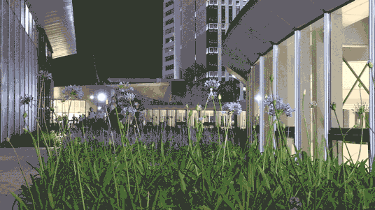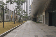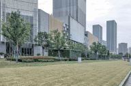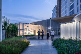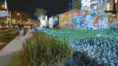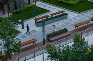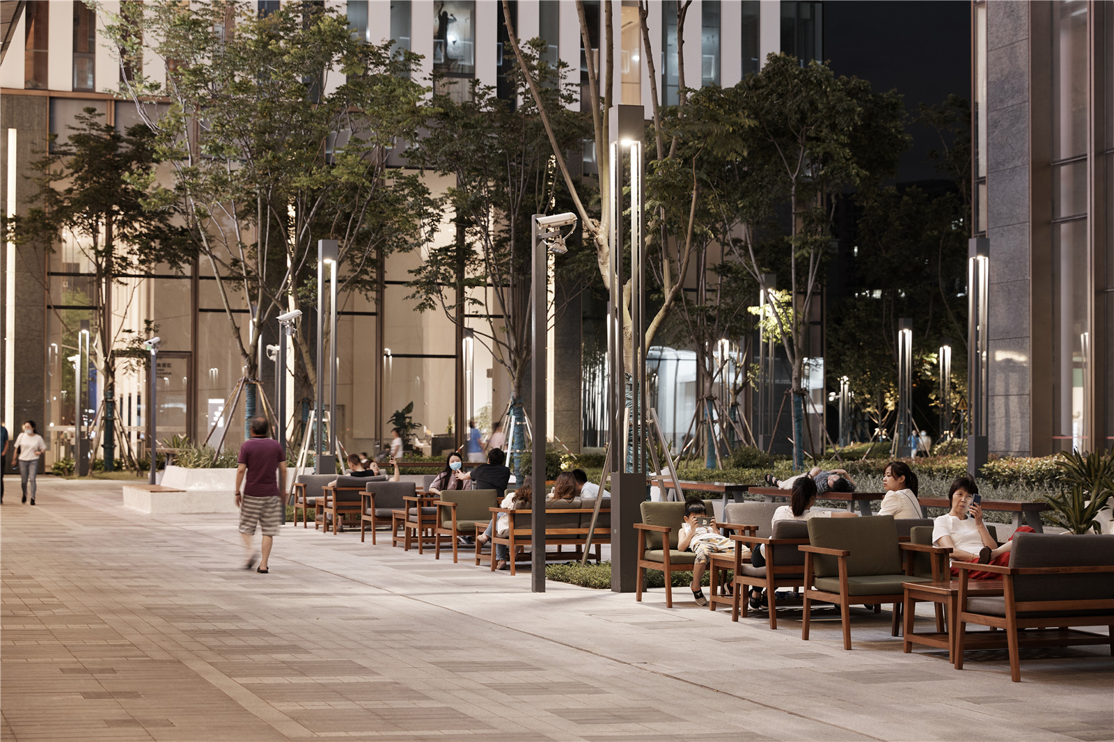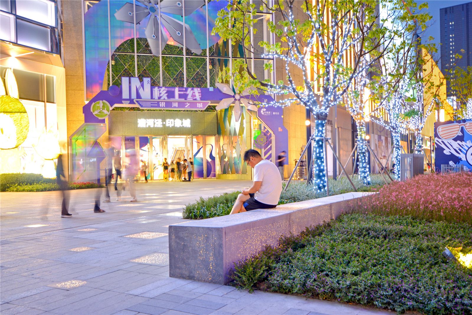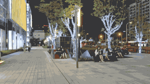 Roaming from the west entrance to the east, the trendy advertisements on the facade of the ventilation shaft in the commercial outer street are particularly eye-catching with the elegant grass and flowers. The light-permeable concrete seats next to the grass flowers contrast with the environment, and at night, the light-permeable concrete seats give a different atmosphere.