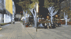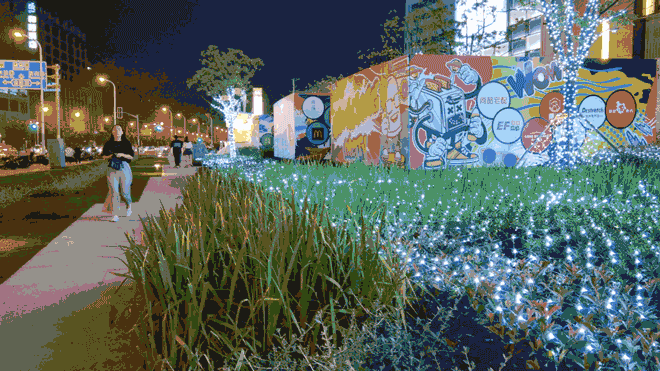 從西入口往東漫游,商業(yè)外街新潮的風(fēng)井立面廣告畫(huà)搭配淡雅的草花顯得格外吸睛。草花旁的透光混凝土座椅與環(huán)境相映成趣,到了夜晚,透光混凝土座椅更是烘托渲染出不一樣的氛圍。