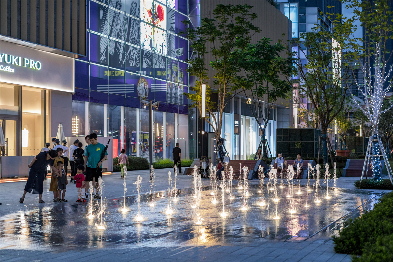 節(jié)假日這里可以作為商業(yè)慶典活動(dòng)的場(chǎng)地,平時(shí)開(kāi)啟旱噴也可以是社區(qū)居民休閑納涼的好去處。