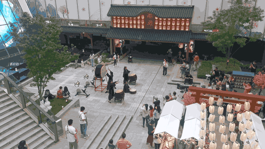 如論是碧海藍(lán)天下的沙灘奇旅還是動(dòng)感單車(chē)的多人PK,亦或井市一番街的和服巡游。下沉廣場(chǎng)的精彩,引得地面來(lái)往的人們駐足觀望。