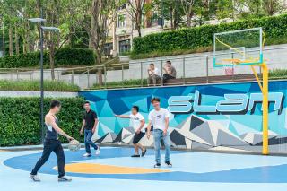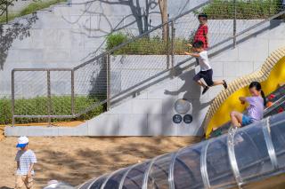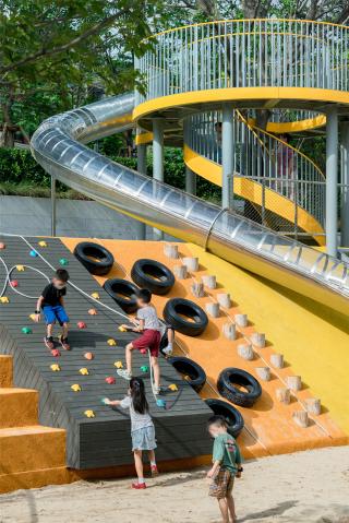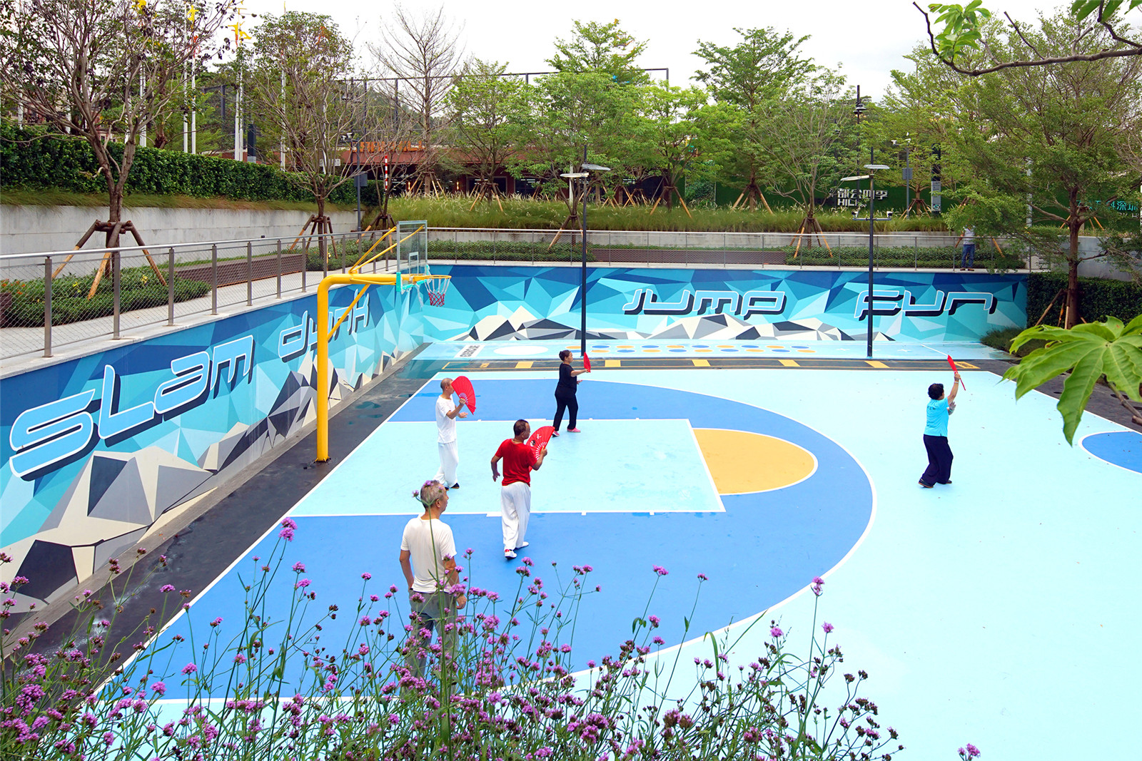 沿大草地往北是相對(duì)獨(dú)立的兩個(gè)專門活動(dòng)空間:酷玩坡地和旋風(fēng)球場(chǎng)。面向大草地的酷玩坡地游戲場(chǎng)讓家長(zhǎng)們?cè)诓莸厣弦材芸吹胶⒆?,同時(shí)也為孩子們提供各種令人興奮的游樂設(shè)備。斜坡成為游戲的重要元素,有多種爬上和滑下的方式。頂層有一個(gè)奇異的樹屋,游樂結(jié)構(gòu)與樹冠交織在一起。這個(gè)樹屋平臺(tái)上可以看見整個(gè)公園的壯觀景色,同時(shí)也是蜿蜒而令人振奮的大滑梯的入口。有彈性的地面和其上的設(shè)計(jì)元素創(chuàng)造了一個(gè)令人興奮的循環(huán)線路,讓孩子們盡情玩耍和探索。逐層升高的綠植臺(tái)地是游戲場(chǎng)的邊界,樹蔭下的乘坐空間方便家長(zhǎng)從多個(gè)方向舒適的監(jiān)護(hù)。黃橙色系在穩(wěn)重灰色的襯托下鮮明歡快,激發(fā)孩子們的好奇心,又不造作。從游戲場(chǎng)往東,旋風(fēng)球場(chǎng)被擋土墻、綠籬環(huán)繞著。場(chǎng)內(nèi)有休息長(zhǎng)凳,而北側(cè)東側(cè)的上層形成看臺(tái)式的走廊和停坐空間,可以俯瞰球場(chǎng)。墻壁上的抽象圖案來源于社區(qū)山地特征與和旋風(fēng)般的籃球速度,與亮眼的色彩、籃球運(yùn)球動(dòng)作單詞一起賦予了空間活力。這個(gè)宜人尺度的場(chǎng)地也適合太極、廣場(chǎng)舞等其他需要平整硬質(zhì)場(chǎng)地的活動(dòng)。地面圖案綜合了其他活動(dòng)的格網(wǎng)到藝術(shù)化的設(shè)計(jì)中,也是期待空間能被更多樣的使用。