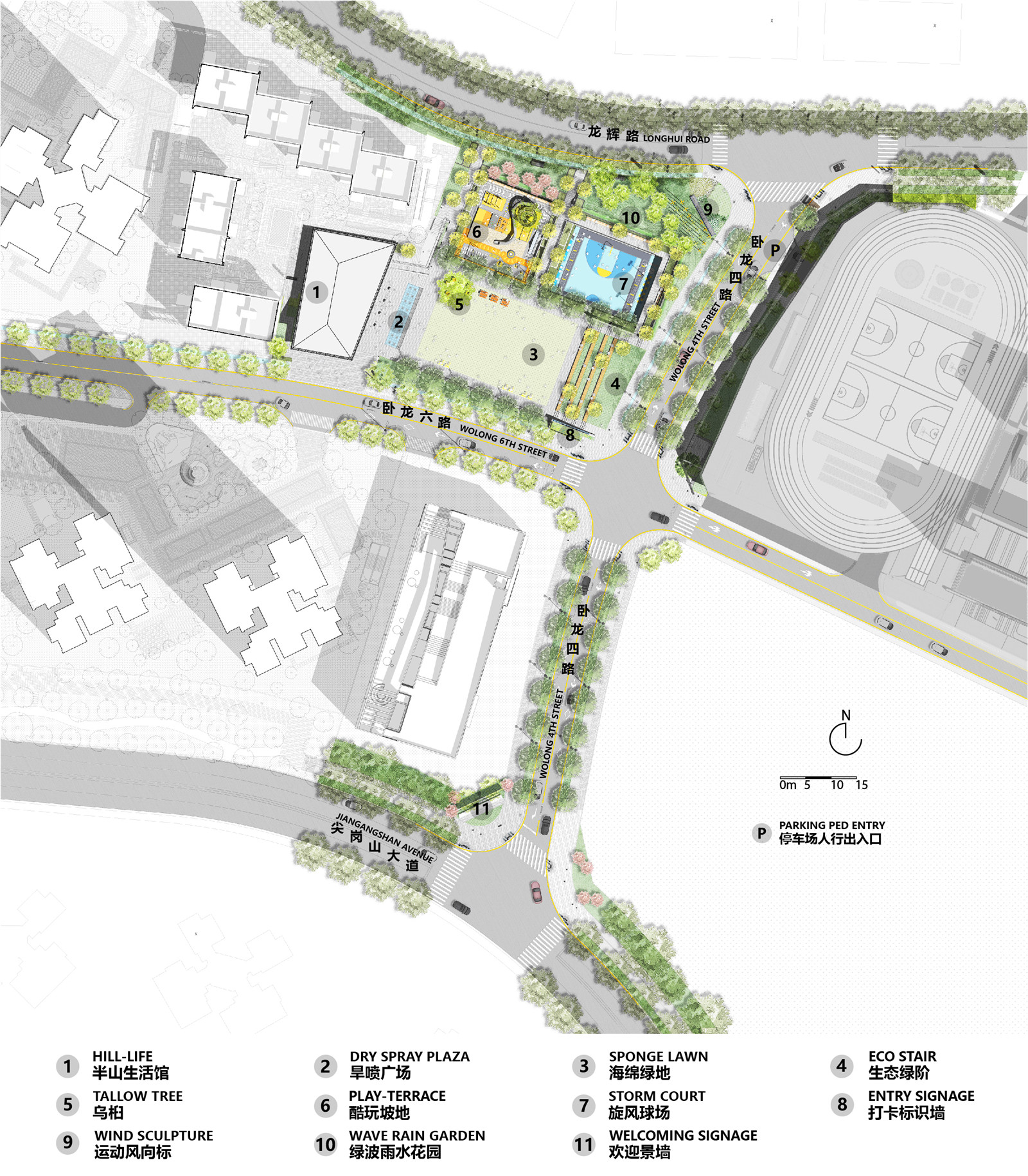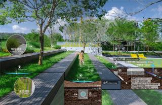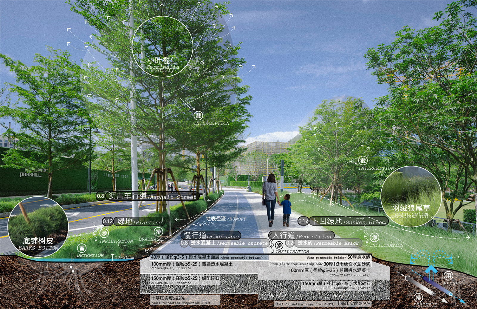 依據(jù)海綿單位的計(jì)算和建議,景觀將具有雨水滯蓄功能的滯留花園、階梯綠地、模塊草地、臺(tái)地花園構(gòu)成系統(tǒng)配合各個(gè)空間的活動(dòng)功能,分布于公園各處,使雨水能就地分區(qū)消化,通過溢流管網(wǎng)、礫石盲管有序組織場(chǎng)地內(nèi)多余雨水匯集至場(chǎng)地西南角的中央蓄水模塊,形成整體雨水管理和回用網(wǎng)絡(luò)。慢行道采用透水磚或透水混凝土,以減少?gòu)搅?。專門設(shè)置的海綿設(shè)施標(biāo)識(shí)牌把雨水設(shè)施可視化,在地普及海綿知識(shí)。