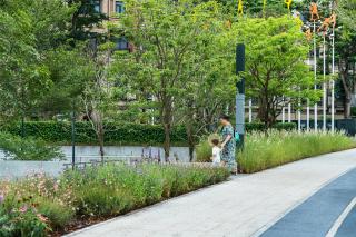 對(duì)公園生態(tài)效益最大化的思考來自設(shè)計(jì)伊始,公園最北側(cè)臺(tái)地的設(shè)計(jì)與現(xiàn)狀標(biāo)高一致,整體保留下一片高大蔥郁的現(xiàn)狀成熟喬木,成為公園最綠色最生態(tài)的背景屏障,繼續(xù)發(fā)揮其減噪、降溫、去塵、雨水截留等生態(tài)功能。新建花園綠地選用了包括部分鄉(xiāng)土植物品種在內(nèi)的豐富種類,常綠、落葉樹與富有四季變化的多年生地被植物搭配,復(fù)層種植,進(jìn)一步提高綠量和生物多樣性。