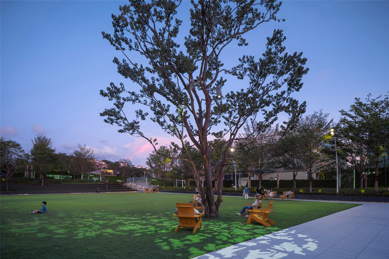 在公園中心,一方長(zhǎng)長(zhǎng)的大草坪被優(yōu)雅的小徑和陰涼的花崗巖長(zhǎng)凳所包圍,尺度宜人。一個(gè)漸變的斜坡邀請(qǐng)?jiān)L客們?cè)诓萜荷舷硎芴萏锸降膭?chǎng)座位。草坪充滿了可能性,支持多種運(yùn)動(dòng)和活動(dòng)的發(fā)生,如運(yùn)動(dòng)、小型音樂會(huì)、市集等。大草坪西北角有一棵優(yōu)美的烏桕,點(diǎn)景的同時(shí)帶來一片蔭涼。樹下色彩靚麗的躺椅和旁邊的野餐桌椅是受歡迎的休憩與聊天的場(chǎng)所。大草坪四面設(shè)置了總長(zhǎng)90.6米、寬90厘米的座墻,加上東側(cè)利用高差設(shè)置了四層林蔭草階看臺(tái),按每人占有60厘米長(zhǎng)度座凳測(cè)算,總共可容納約300人同時(shí)在長(zhǎng)凳上面向中央草地乘坐。有層次的乘坐和種植勾勒出了富有雕塑感和季節(jié)變化的空間框架,賦予了草地強(qiáng)烈和靈活的舞臺(tái)感,實(shí)踐著以使用者為主角的設(shè)想。