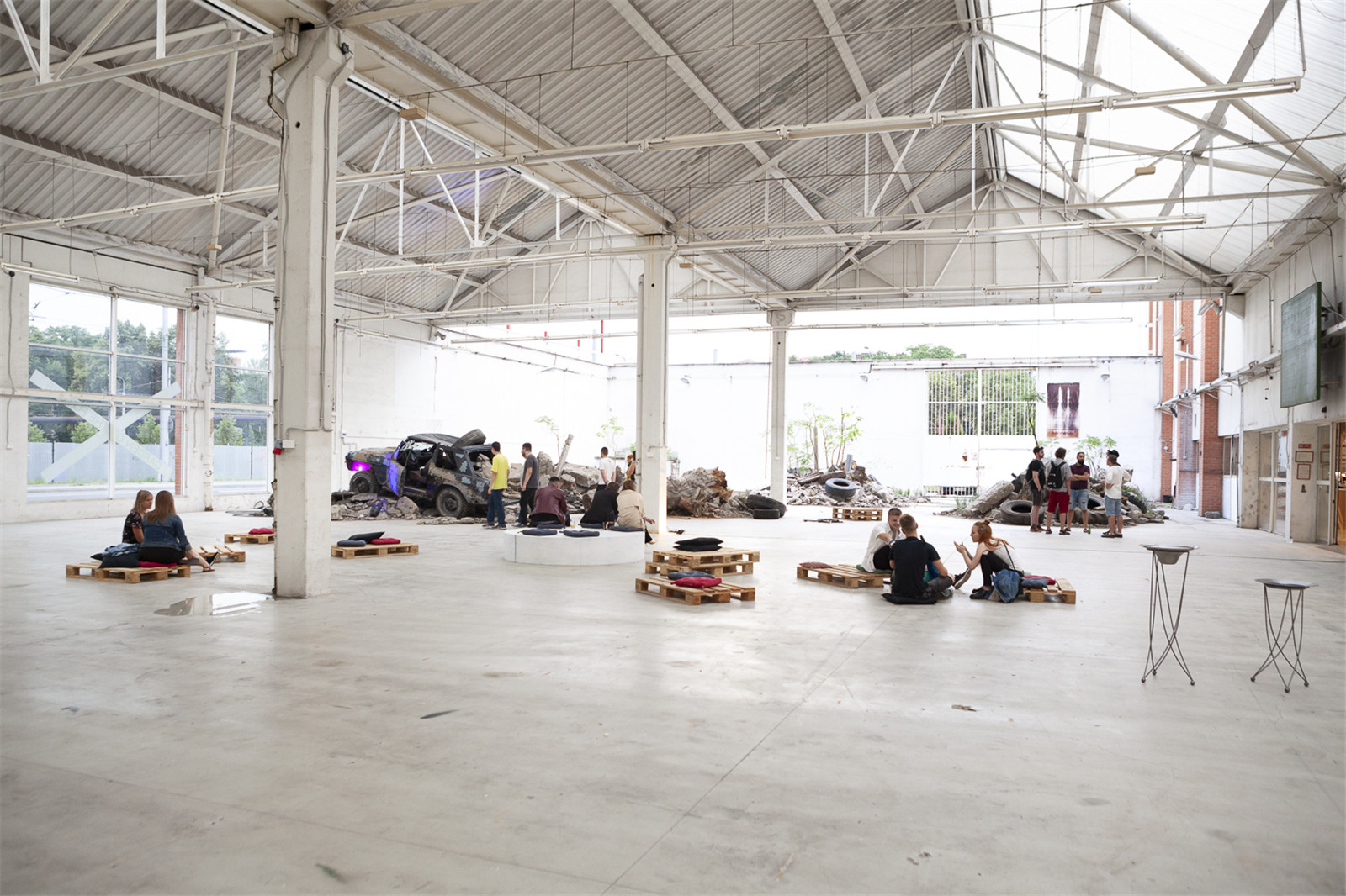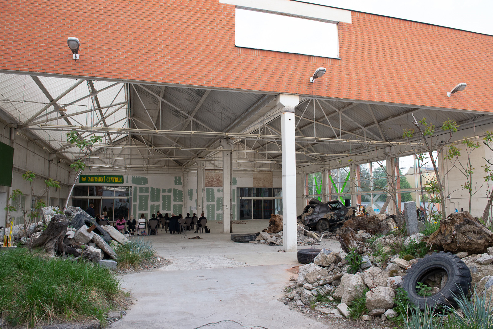 When an artistic vision meets landscape architecture, a project of a unique kind evolves. In the search for a temporary art base for PLATO, a contemporary visual arts platform funded by the city of Ostrava, abandoned Hobby market with 5.000 sqm hall was occupied. The wide space had great potential, while the indoor area could perform as a gallery and events space, the walled and semi-roofed outdoor space, would become an atypical garden/stage for all different sorts of gallery’s activities. PLATO was searching for the idea how to make it work.