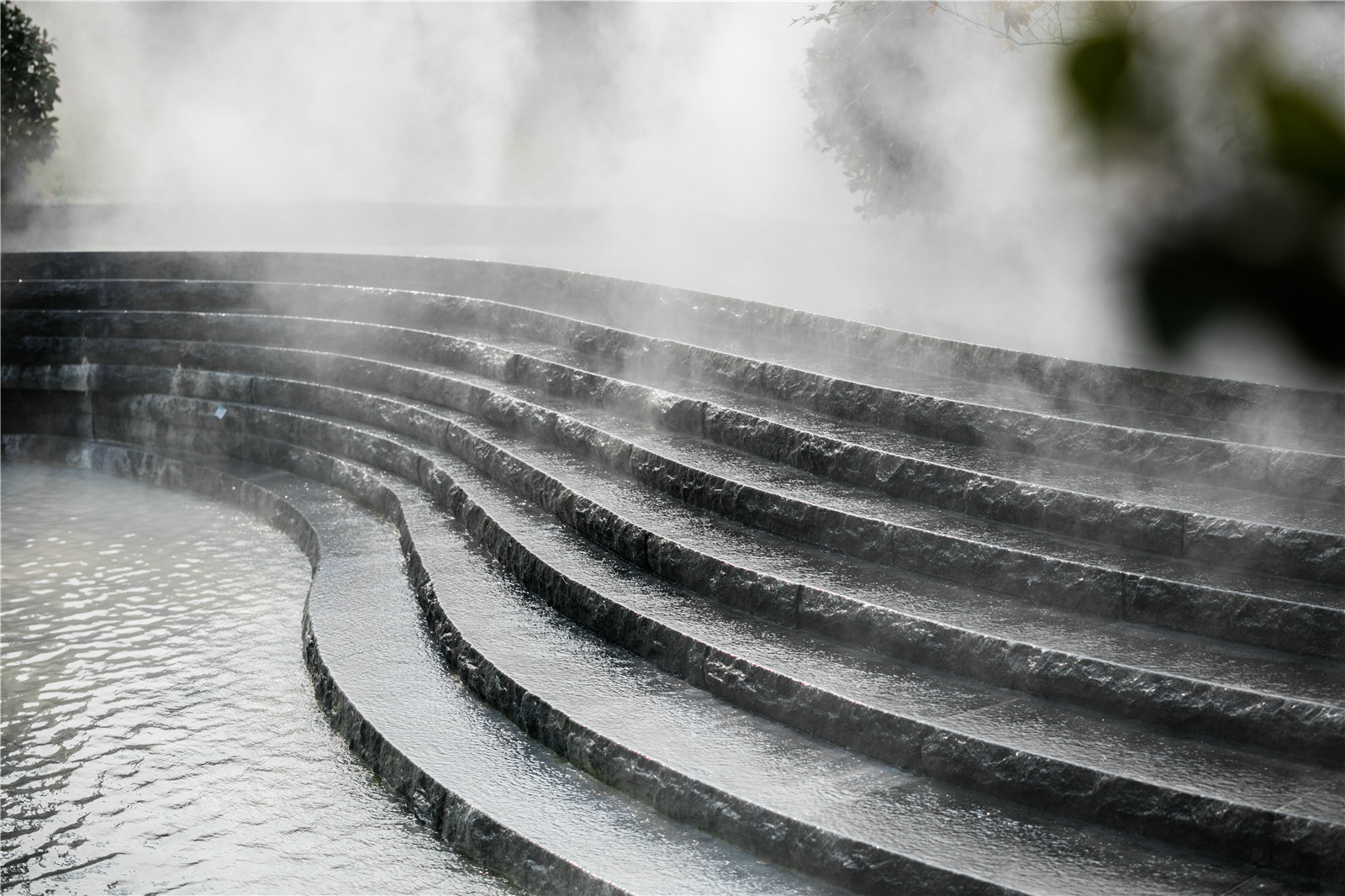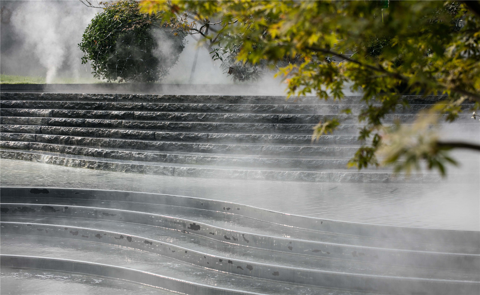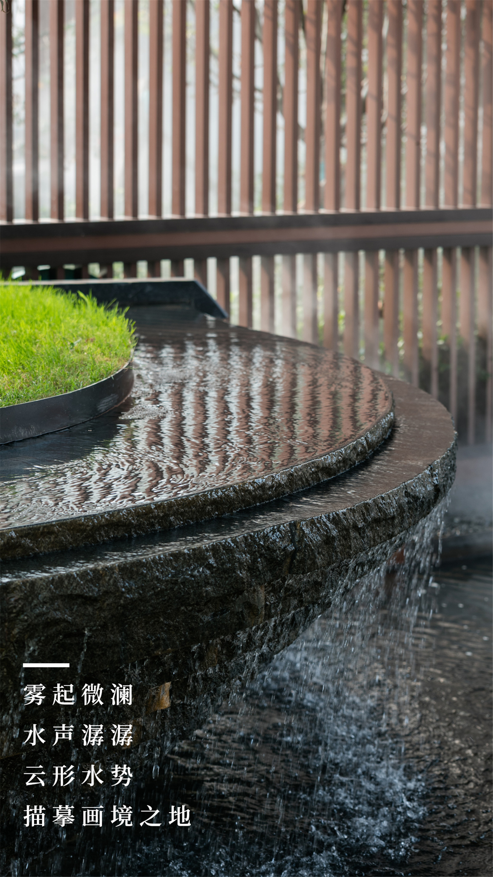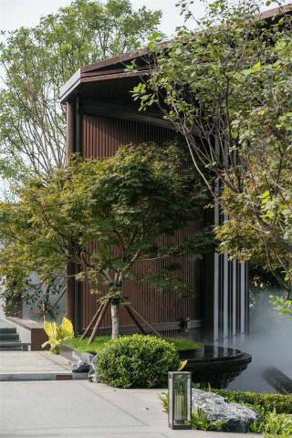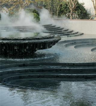 穿行其中,感受光影變化帶來(lái)的空間驚喜,拾階而上,一片豁然開(kāi)朗之境。有山皆是園,無(wú)水不成景,霧起微瀾,水聲潺潺,云形水勢(shì),描摹畫境之地。