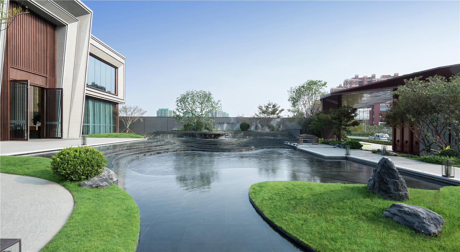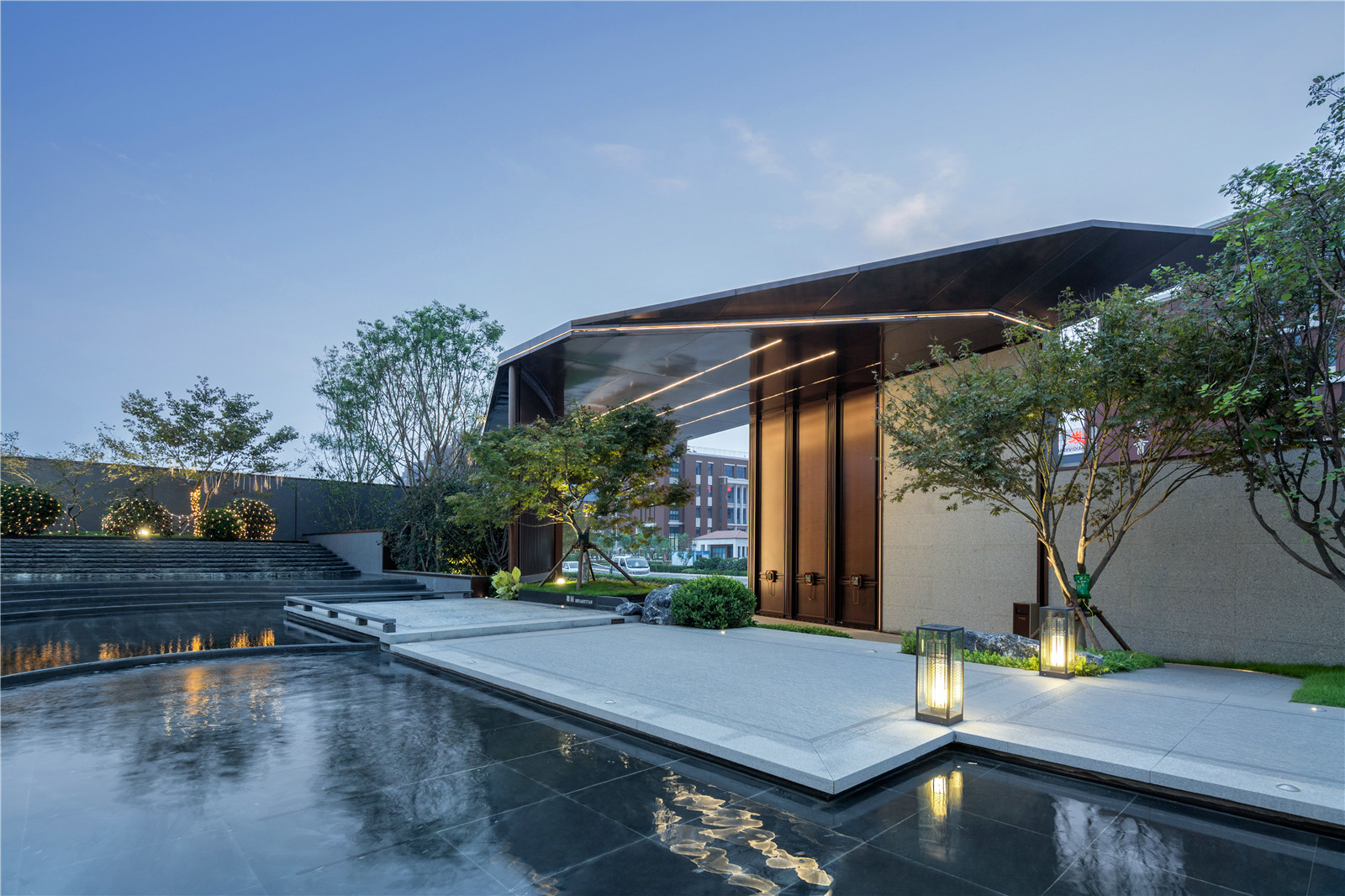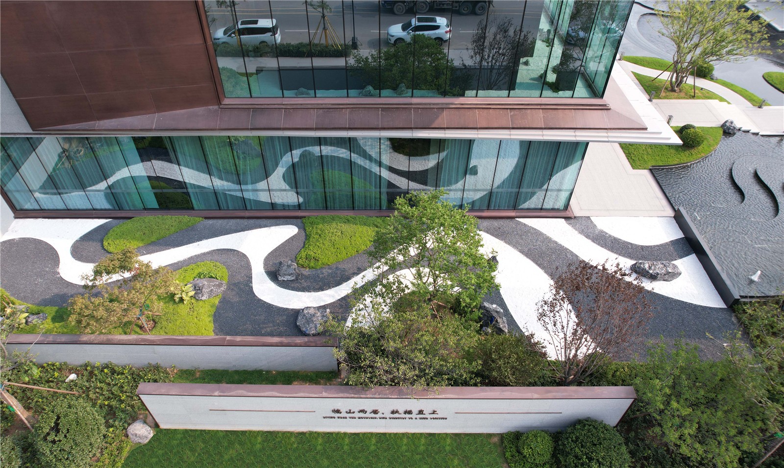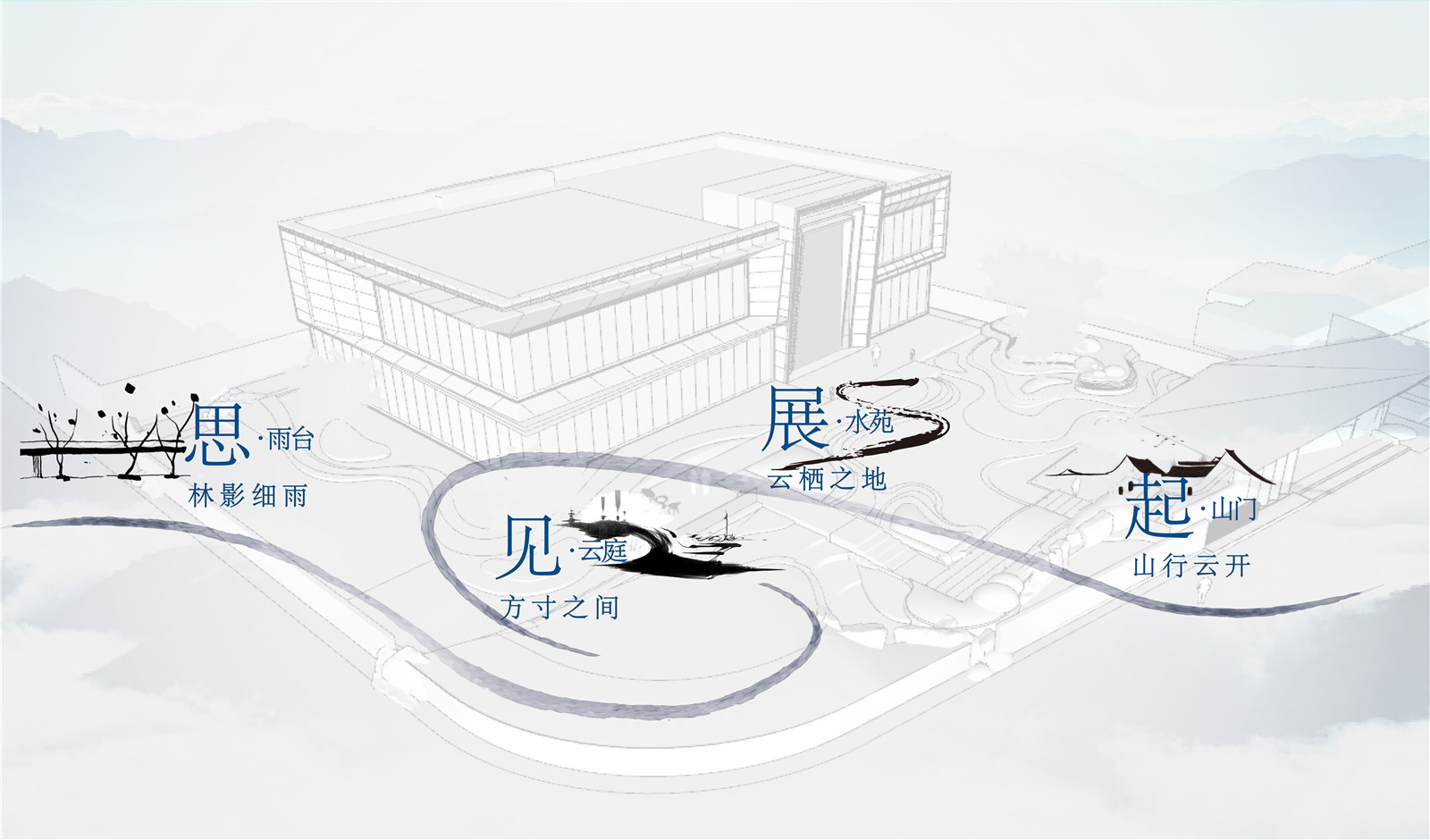 從所處區(qū)域地標(biāo)白云山空間意象入手,在山形、云深、水曲中提煉出簡(jiǎn)潔精致的線條語(yǔ)言,“和”乎于景、“和”乎于道,方、正、曲、直間展現(xiàn)詩(shī)意棲居之所,用景觀的柔美之意連接主體建筑與市政界面間的剛硬之態(tài),緩和場(chǎng)地內(nèi)外的空間直視感官?zèng)_突,引導(dǎo)進(jìn)入者感受空間轉(zhuǎn)換過(guò)程中的禮序之道、自然之美、宜人之境。