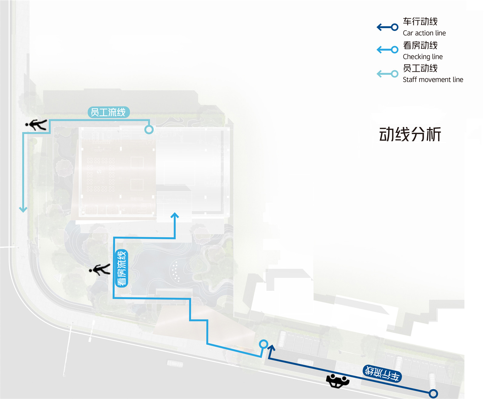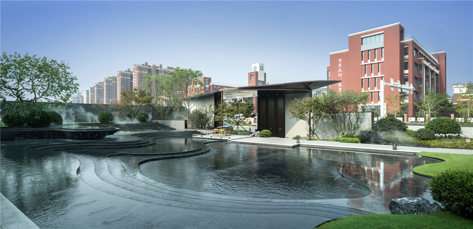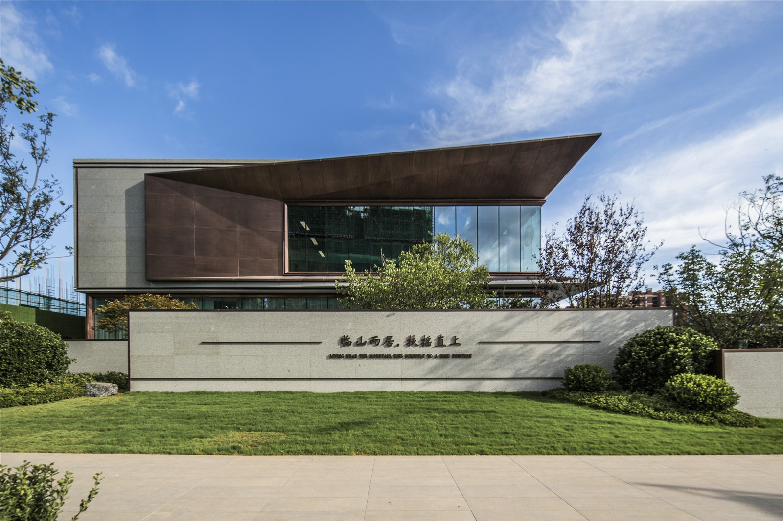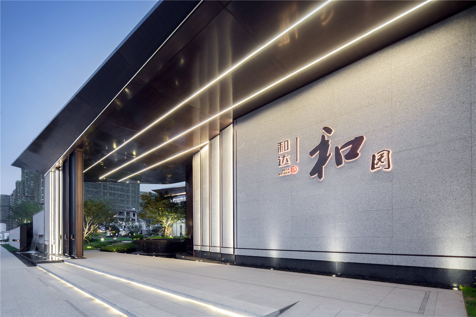 從所處區(qū)域地標(biāo)白云山空間意象入手,在山形、云深、水曲中提煉出簡(jiǎn)潔精致的線條語(yǔ)言,“和”乎于景、“和”乎于道,方、正、曲、直間展現(xiàn)詩(shī)意棲居之所,用景觀的柔美之意連接主體建筑與市政界面間的剛硬之態(tài),緩和場(chǎng)地內(nèi)外的空間直視感官?zèng)_突,引導(dǎo)進(jìn)入者感受空間轉(zhuǎn)換過(guò)程中的禮序之道、自然之美、宜人之境。