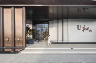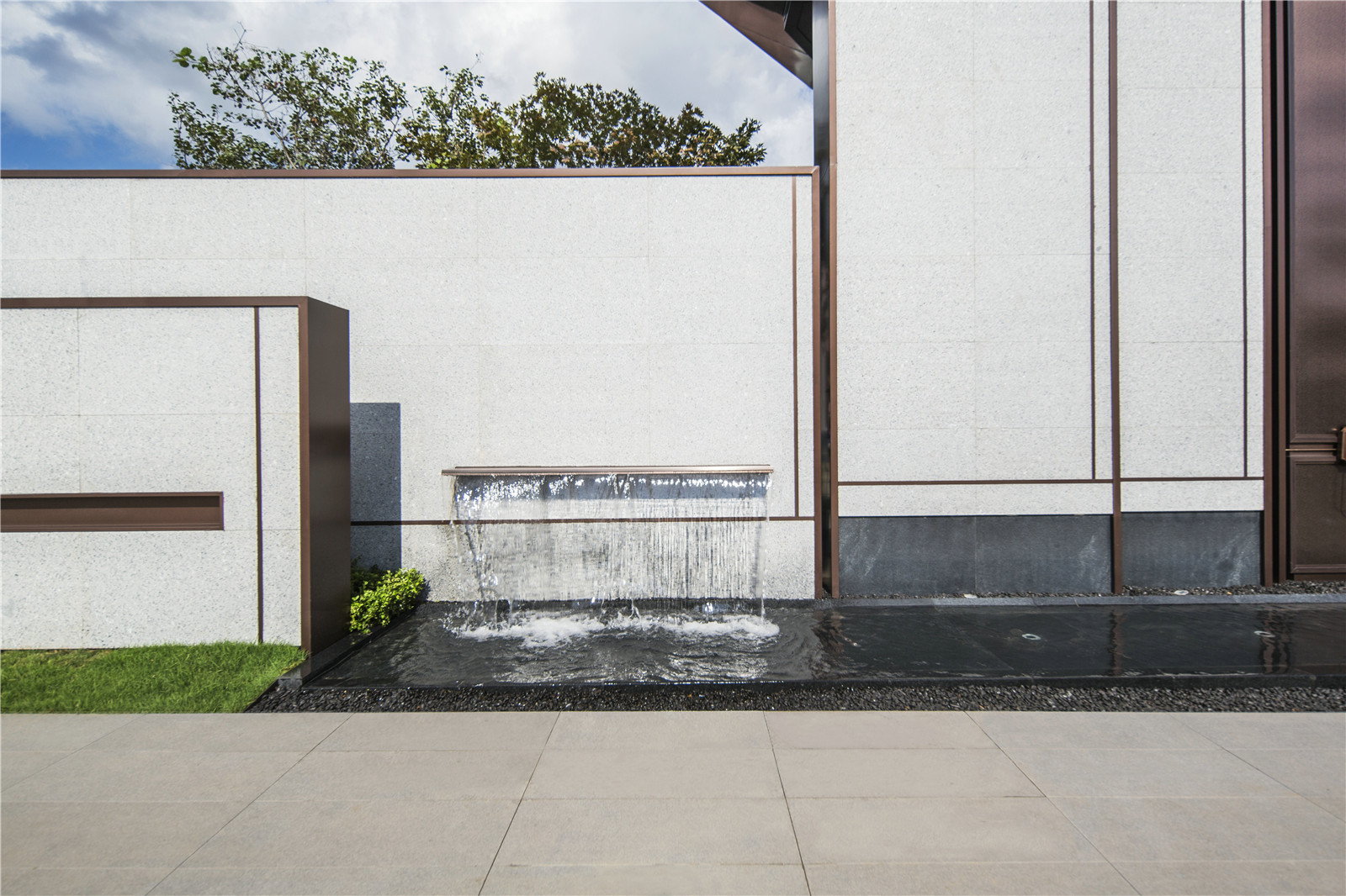 精致簡(jiǎn)潔的古銅色門飾線腳與米色石材拼接,映襯著精工之下的品質(zhì)之感;橫向光影與豎向線條交錯(cuò)間,明暗過(guò)渡形成層層遞進(jìn)的序列感。