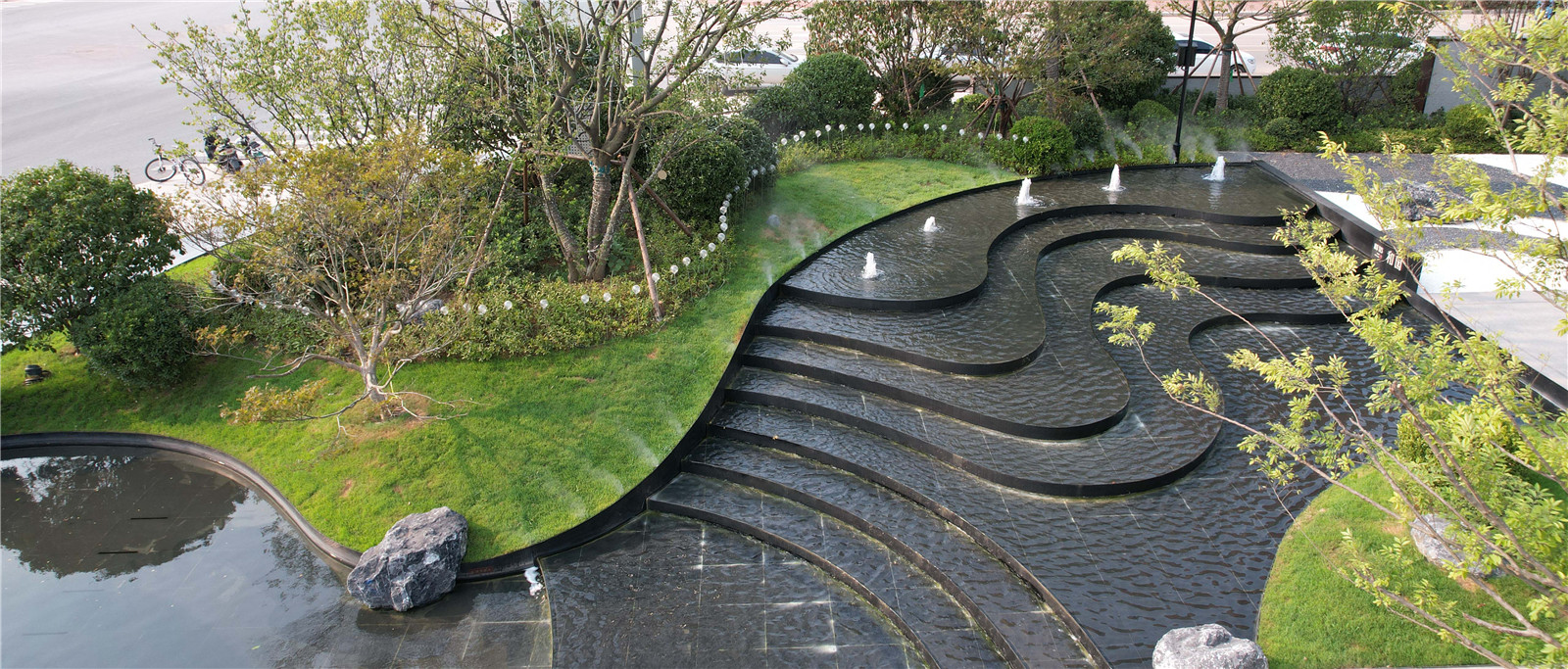 深色曲線水池依地勢(shì)展開(kāi),綠島星羅棋布,山澗、溪谷、飛瀑、幽潭融入其中,以小見(jiàn)大塑造山居歲月下新云水謠。
