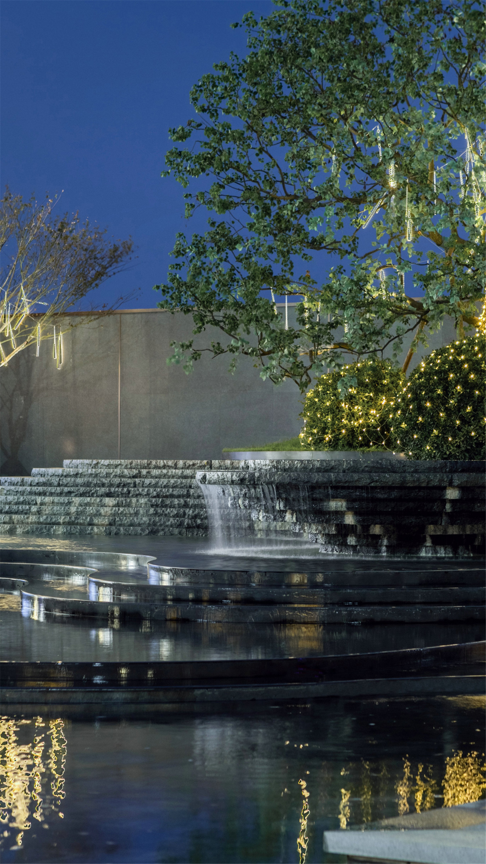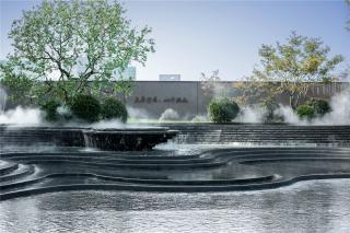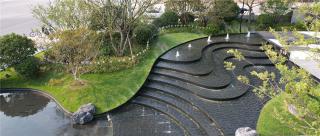 利用參數(shù)化進(jìn)行建模,模仿自然水景效果,每一塊石材都精心切割打樣,組合出曲線交疊的韻律美感。