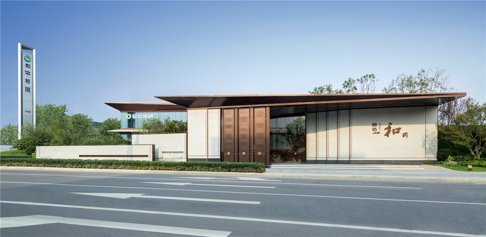 入口禮序,府門側(cè)開(kāi);一檐飛架東西,與主體建筑形成呼應(yīng)之勢(shì);高低錯(cuò)落景墻與大門入口,擴(kuò)張正面視覺(jué)沖擊力,營(yíng)造府居大器風(fēng)范。