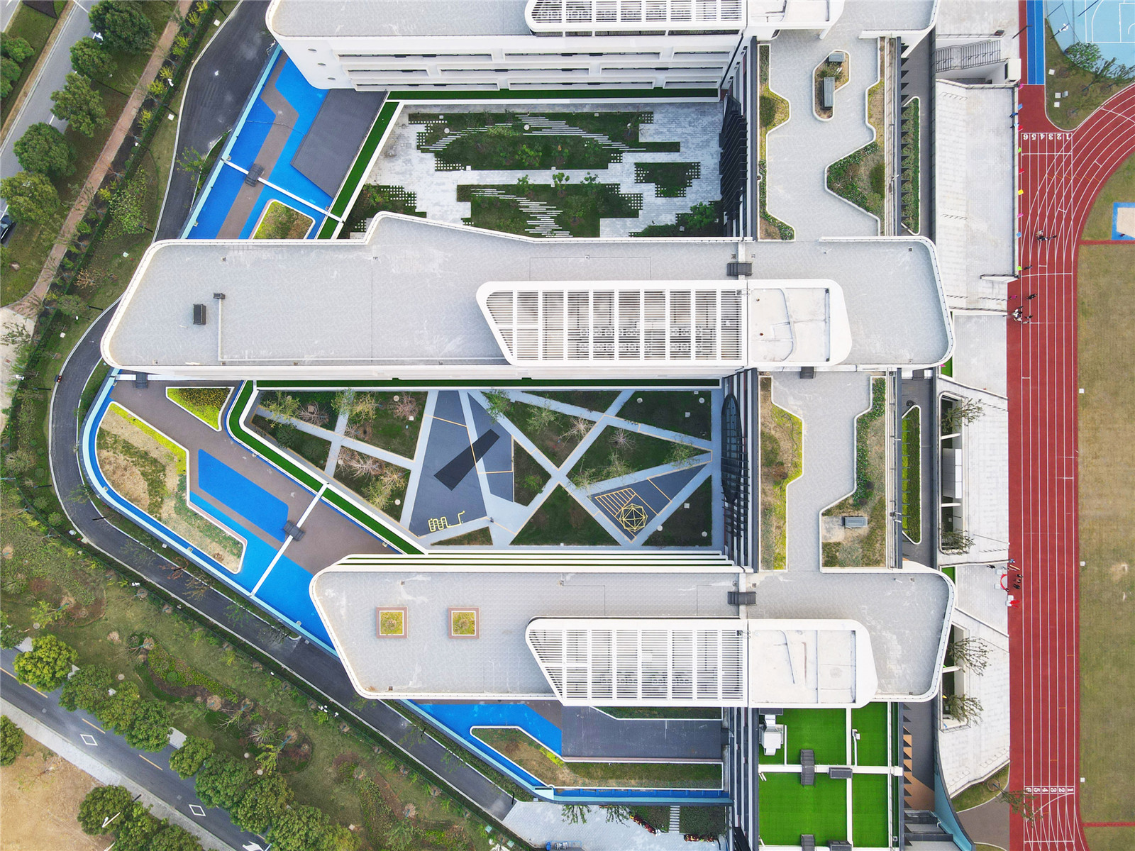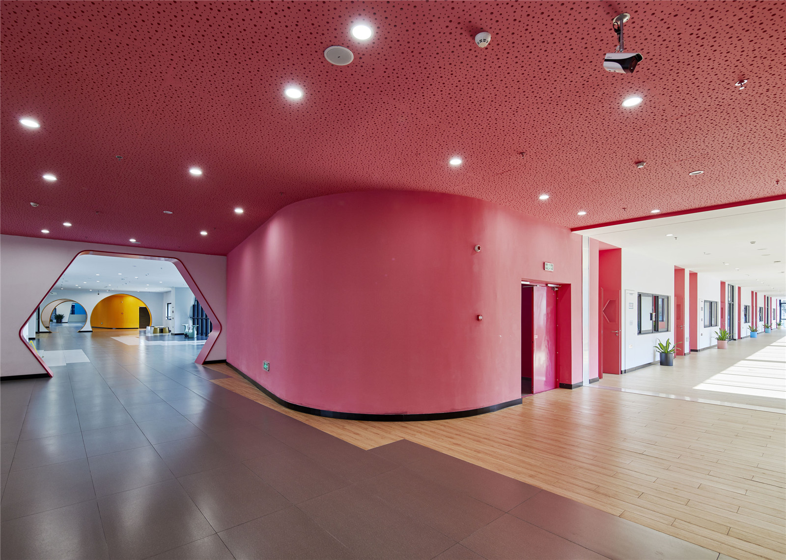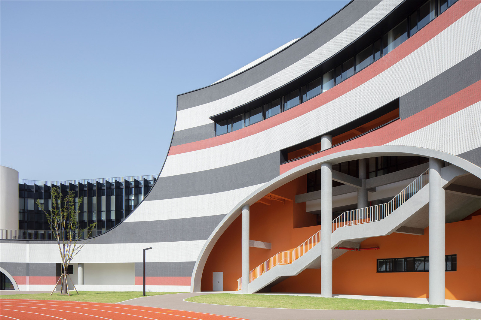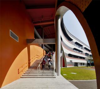 六道規(guī)則的橫梁呈太陽(yáng)形匯集,容納了改良的教室,橫跨蜿蜒的梁。