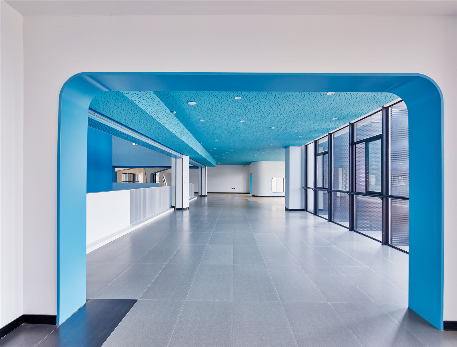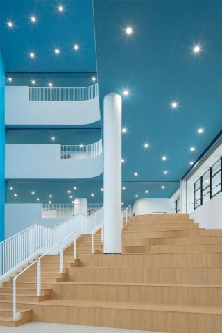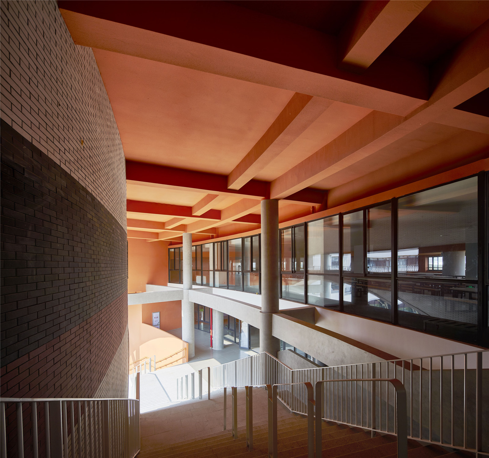 環(huán)繞著開(kāi)放空間的梁容納了一個(gè)創(chuàng)新的網(wǎng)絡(luò)——傳統(tǒng)的學(xué)校走廊變成了一個(gè)松散而開(kāi)闊的空間,鼓勵(lì)非正式的教學(xué)和學(xué)習(xí)。這些巨大的走廊為展覽和大型小組作業(yè)等非正式活動(dòng)提供了一些半封閉的學(xué)習(xí)空間。
