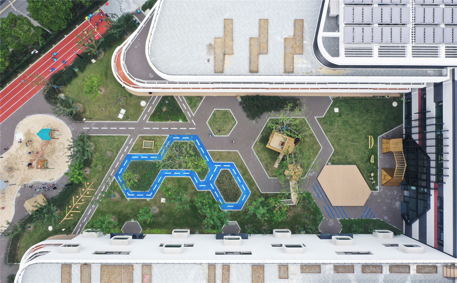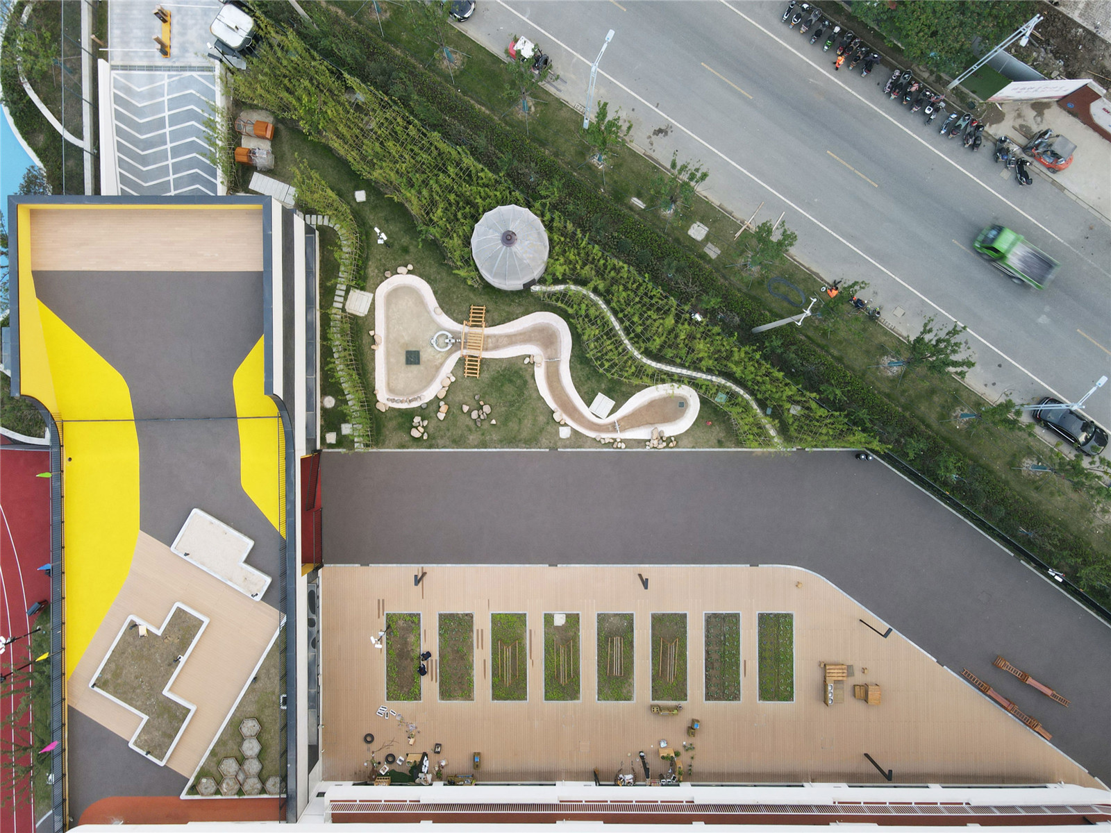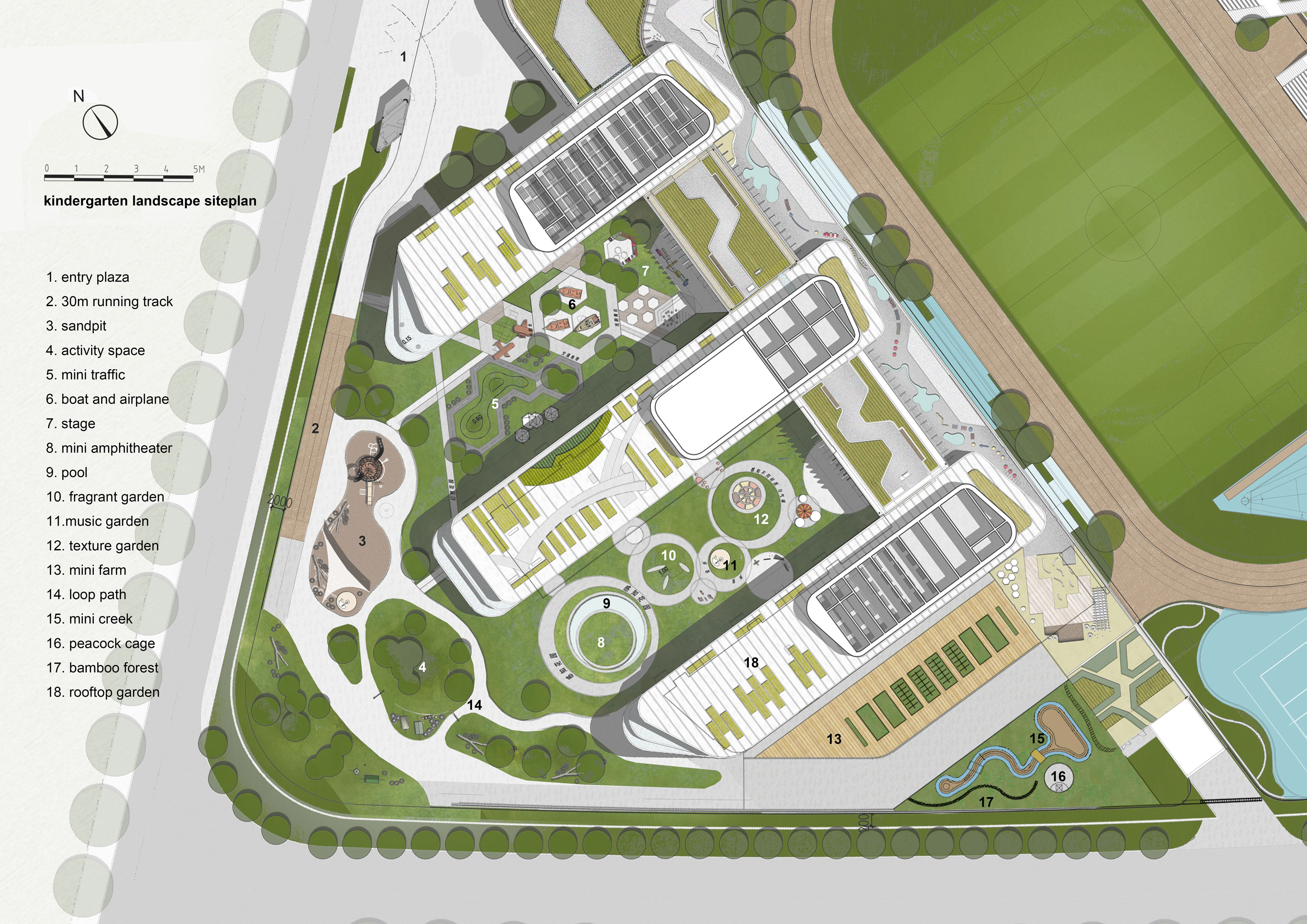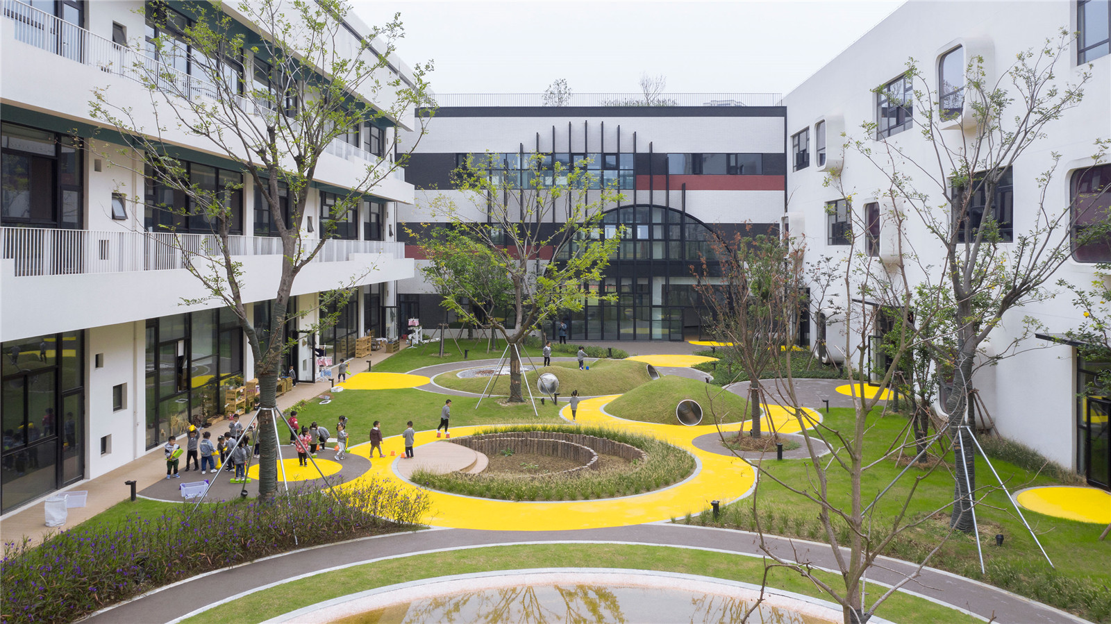五個(gè)主題花園為幼兒園提供了不可思議的空間:在聯(lián)想花園中培養(yǎng)兒童的想象力并模擬實(shí)現(xiàn);在機(jī)能花園中跳躍攀爬、蕩秋千、滑滑梯鍛煉孩子的體能;在自然花園中挖土、種植、輕輕拍打、穿梭于竹海中,能夠培養(yǎng)孩子的自然意識(shí);在勞動(dòng)花園中孩子們可以學(xué)習(xí)農(nóng)作、家務(wù)以及培養(yǎng)管理能力;在感官花園中聞花的芳香、品草的味道、感受水的流動(dòng)、聆聽(tīng)管道聲音、真實(shí)地觸摸、體驗(yàn)自然。