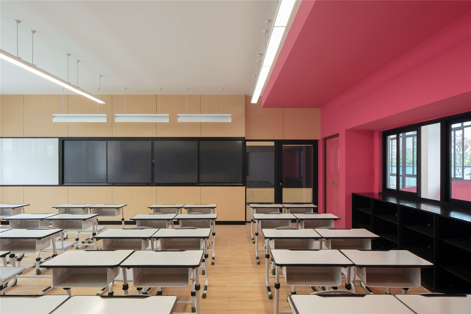 在這些橫梁中,每?jī)蓚€(gè)傳統(tǒng)教室都有一個(gè)玻璃墻面的會(huì)議室。這使得較小的學(xué)生小組能夠在不分散課堂注意力的情況下進(jìn)行交流,并且在老師的掌握范圍內(nèi)。