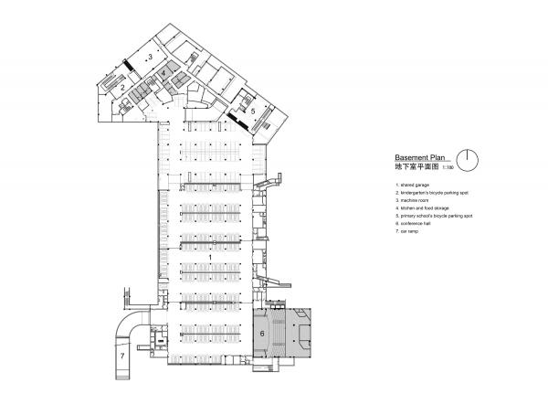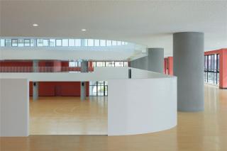 該場(chǎng)地被設(shè)想為一個(gè)建筑平臺(tái),所需的各種開(kāi)放空間都可從該平臺(tái)提?。哼\(yùn)動(dòng)場(chǎng)、幼兒園孩子的操場(chǎng)、小學(xué)生的庭院、兩所學(xué)校的入口、還有學(xué)校和人行道之間的一圈綠地。