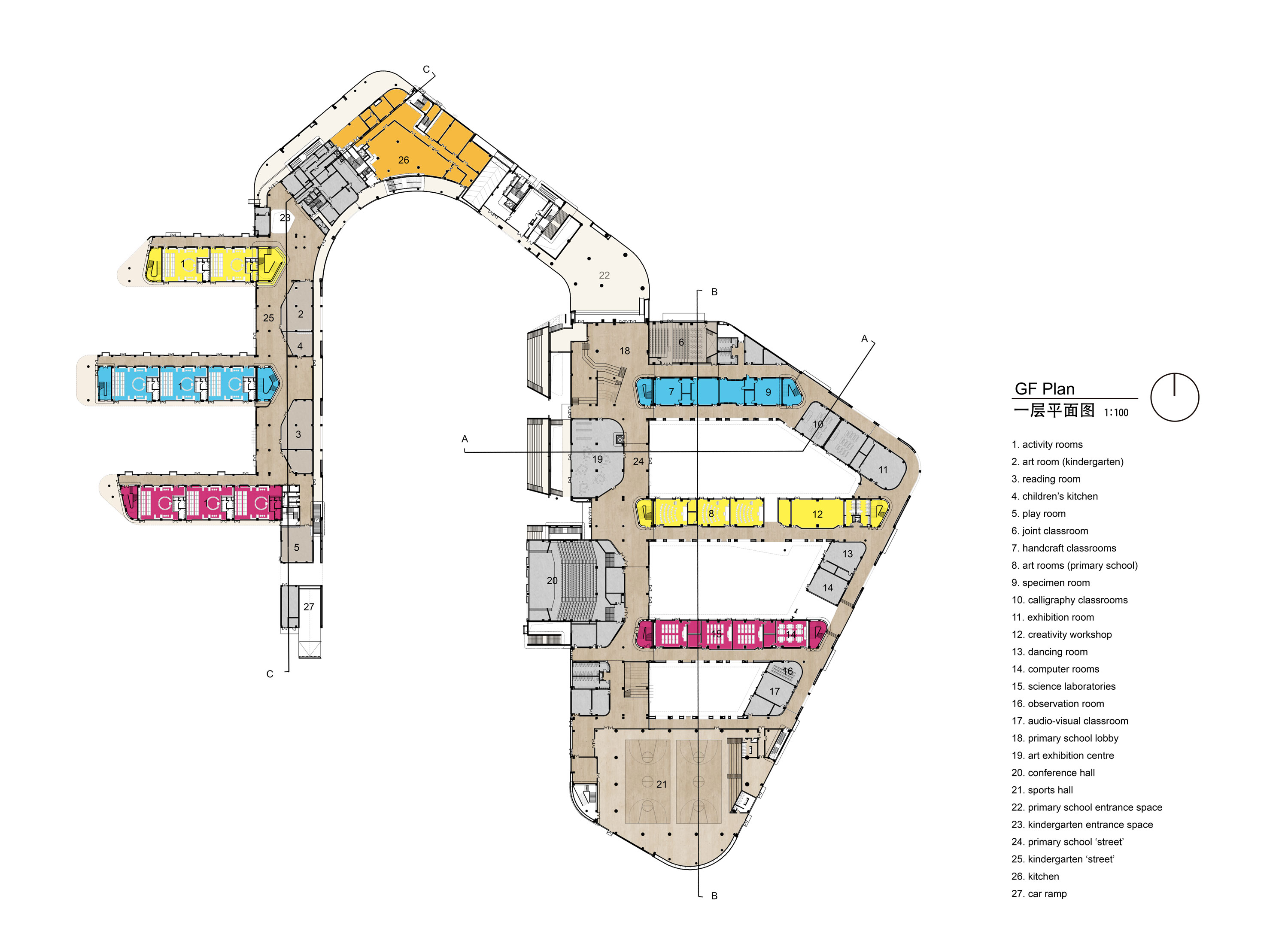 小學(xué):一到六年級(jí)48個(gè)教室、多功能劇場(chǎng)、階梯教室、展廳、圖書館、藝術(shù)教室、電腦教室、書法教室、音樂(lè)教室、舞蹈教室、手工教室、科學(xué)實(shí)驗(yàn)室、廣播教室、食堂、體育活動(dòng)中心等