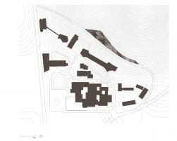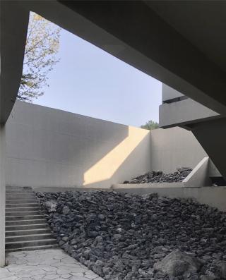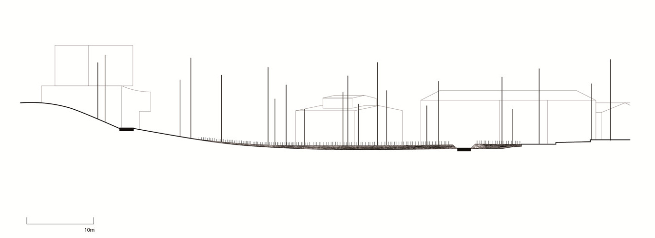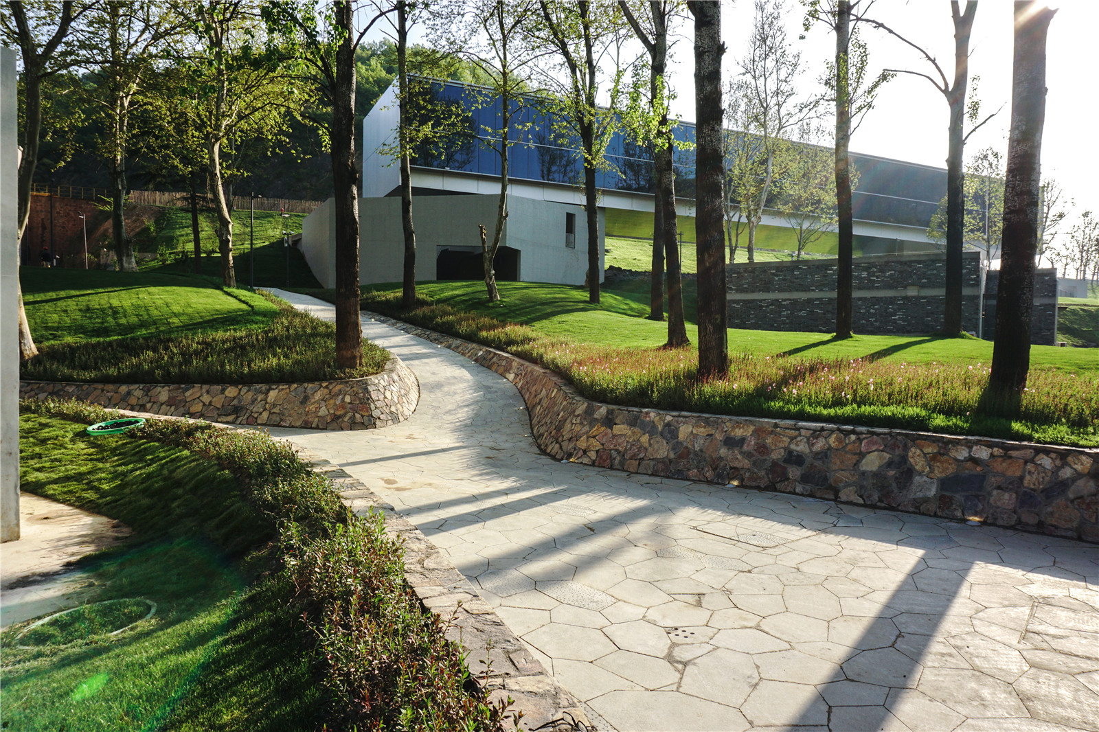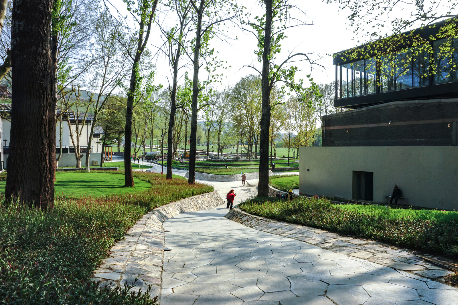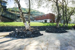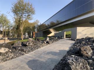 Another intervention of the design strategy is to mimic the stone mining process, to recycle and reuse the boulders from excavation during the construction. The boulders from the ground during site excavation are used as material and sculptural feature in the park. Big stones have been placed to form a monumental entering experience that expresses a hint of heritage at the entrance of the museum. Like nature guardians to a place to remember, loyal protectors to a shrine to respect. The handsome power of the ground is revealed again by its geological solidness, heaviness, and calm.
