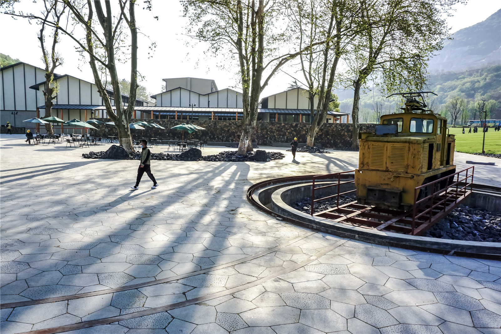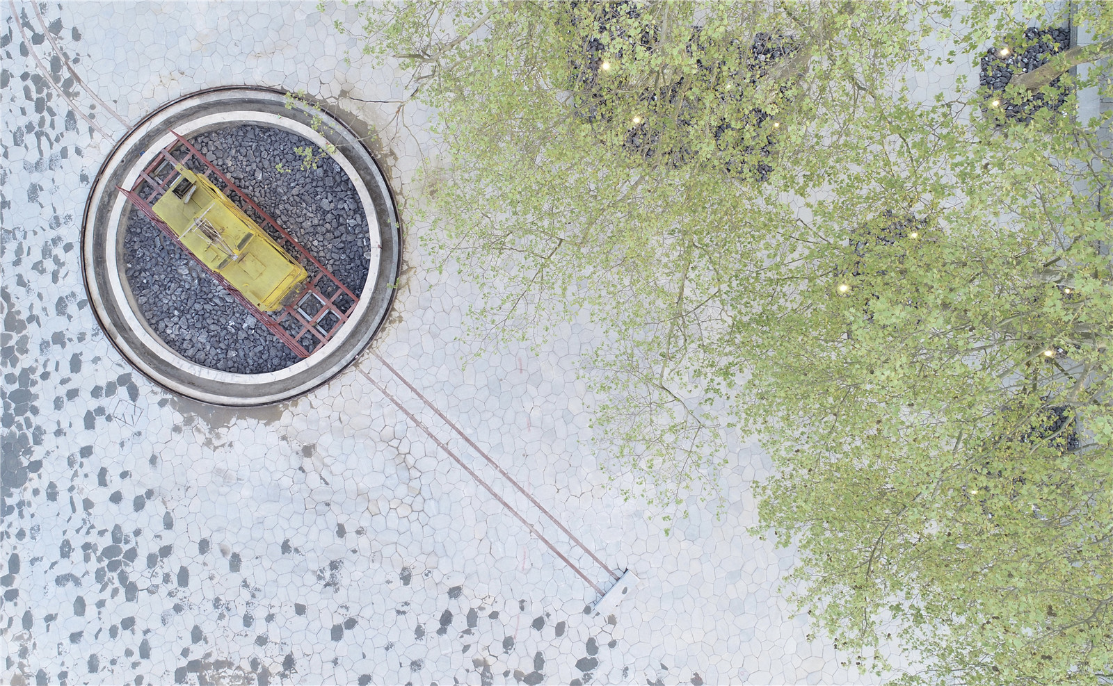 Another feature of the park is the old stone mining infrastructure system at the site, which includes a rail system for shipping trains, and a turning wheel pool for trains to park. The design strategy is to reserve the special pool as an iconic feature on the plaza, and to restore the damaged rails. The pool used to serve as an industrial item is integrated with new water features to be the new focal fountain at the site. A restored rail network is restored again to represent the stone mining history of the past.