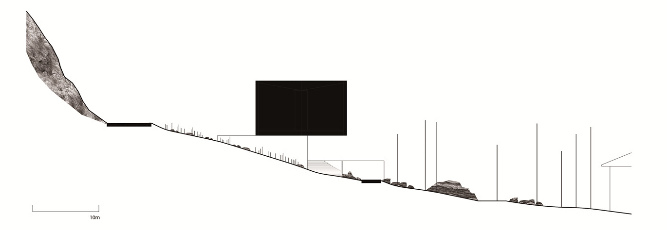為了保護(hù)場地的歷史遺跡,建筑師謹(jǐn)慎地翻新了現(xiàn)狀建筑,將閑置的倉庫和儲(chǔ)存塔變?yōu)榱怂囆g(shù)中心,博物館和畫廊。為了突出地質(zhì)遺跡的大山壁,主體建筑以一個(gè)大型懸挑系統(tǒng)構(gòu)成, 并框景了整個(gè)山崖。自然的力量和建筑的力量創(chuàng)造出對(duì)比的張力。兩方之間戲劇化的體驗(yàn)喚起了對(duì)懸崖的感知,及對(duì)尺度的覺醒 — 人之渺小,自然之宏偉