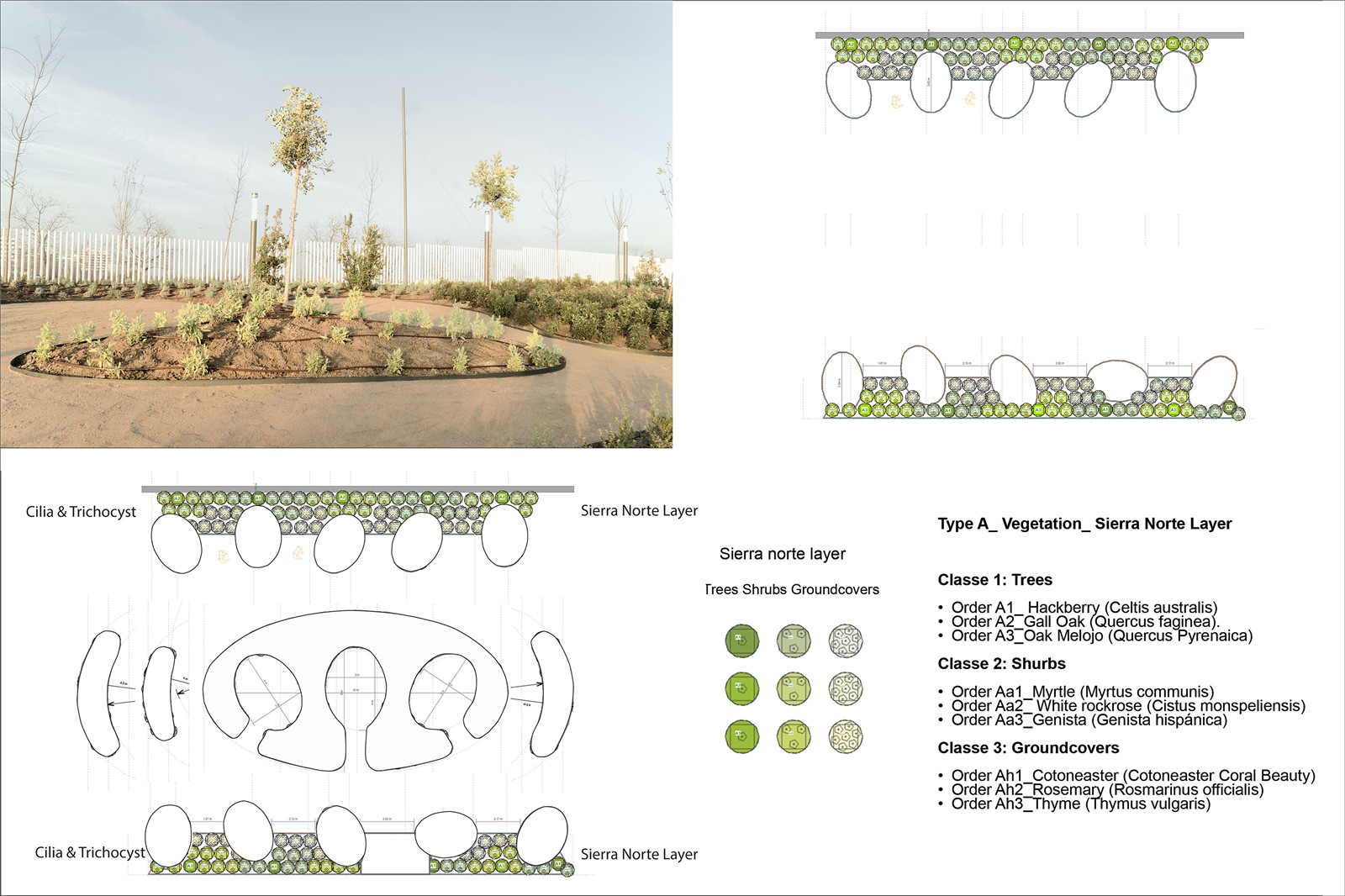 Protection system_Cell Wall. The green bands parallel to the three buildings of the hospital complex close to the landscape intervention where the presence of rows of trees, aromatic shrubs, and colorful groundcovers make up a highly sensitive natural environment close to the Hospital. The scheme of clean roads parallel to the street that joins the three pavilions follows the straight lines that characterize the hospital corridors. The parallel green bands to the main road meet the objective of border and protection taking as reference the planting palette of the Sierra Norte Layer.