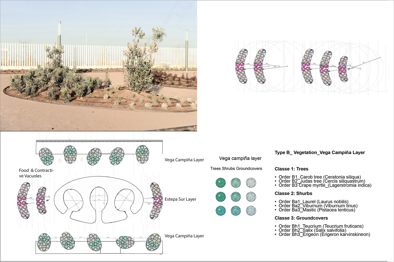 Circulation system _Vacuoles. The landscape design made of elliptical and longitudinal green areas leaves controlled enclosures between them and opened views over parks around. These "parentheses" enclose the core areas and lead to safe walkways. The recovery of Covid-19 patients can leave side effects such as the formation of thrombosis in the leg veins by increasing blood flow. Doctors recommend daily exercise and long walks during recovery. These green areas take as reference the planting palette of the Vega Campi?a Layer.