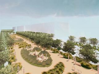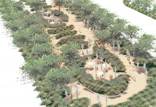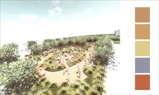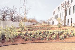 匯集點, 細胞核DNA。周圍環(huán)繞著不會引發(fā)呼吸道問題或過敏的果樹、芳香灌木和地被。以家庭為單位的到訪者可以被帶到這些戶外候診室,未來還將放置長凳、椅子、桌子于其中。軟景借鑒了南部草原的植物搭配。這些微空間能供所有年齡段的人玩耍、遠程辦公以及休息。