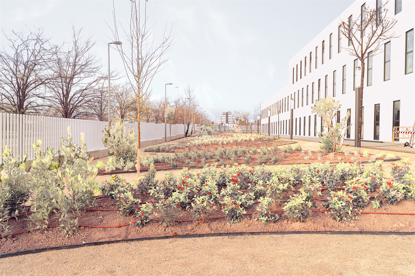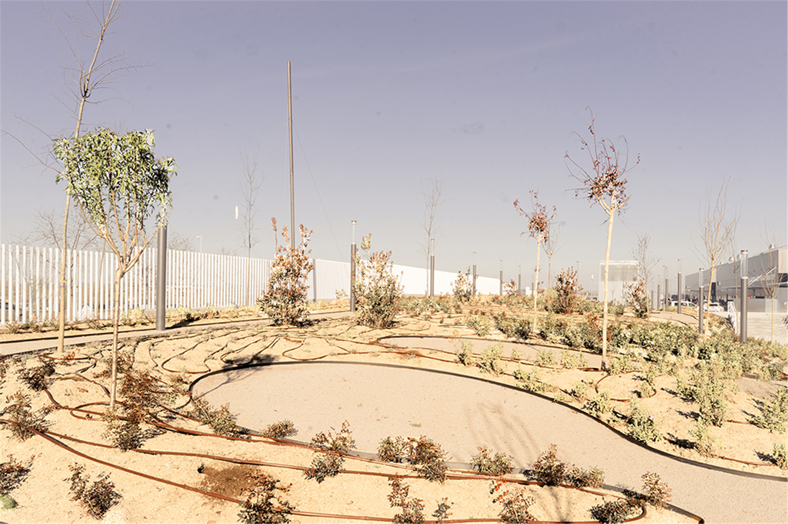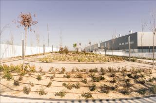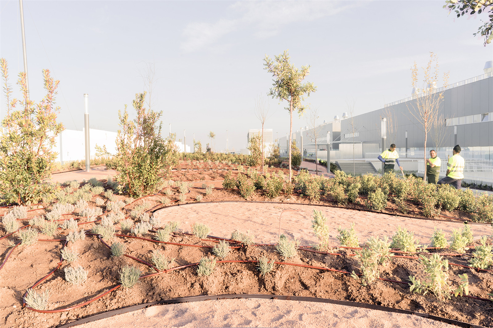 Due to dry climatic conditions, adapted species with low water demand have been selected reducing the risk of allergies or respiratory problems. The topography has been modified to conserve rainwater and direct it to green areas that act as sponges that reduce runoff, store water, remove sediment and pollutants and release it into other ecosystems.