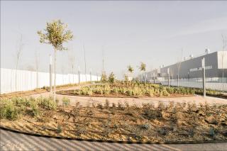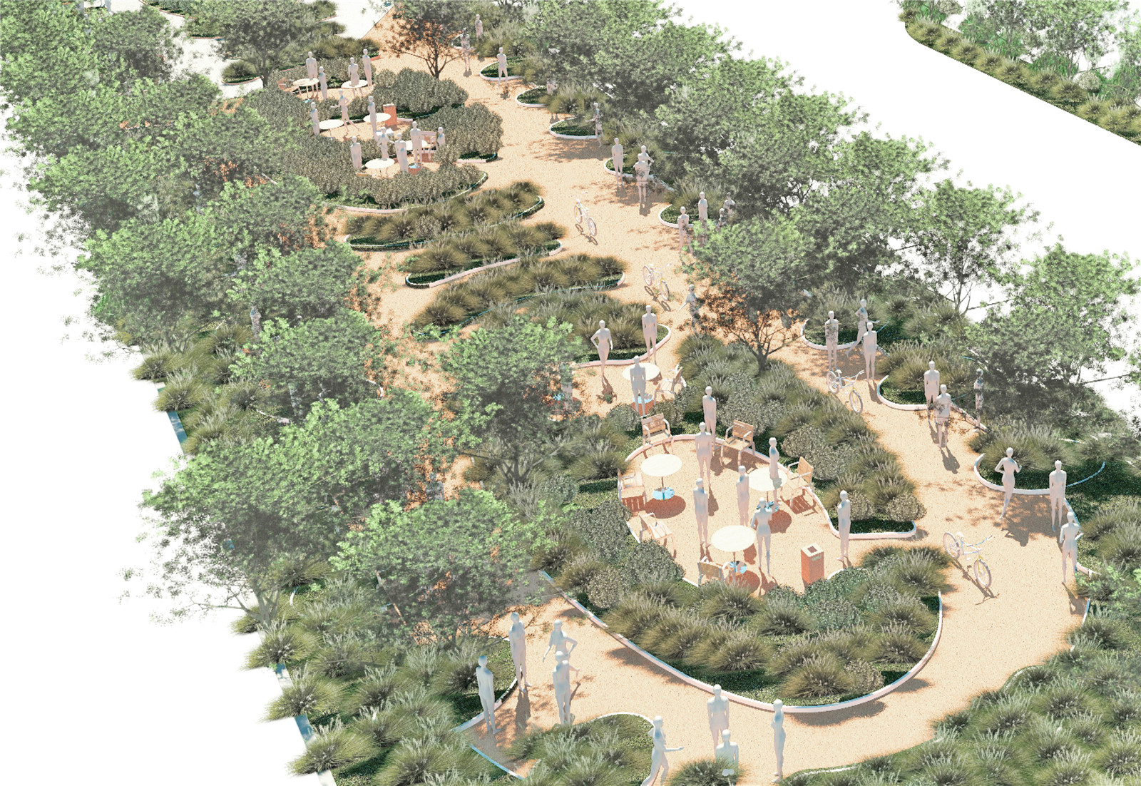 由于氣候條件干燥,植物多選用耐旱品種,還需兼顧減少過敏或引發(fā)呼吸道疾病的風險。重塑后的的地形可保存雨水,并將其引至那些用作“海綿”的綠地,以減少徑流、存儲雨水、清理沉積物和污染物,并將其融入到周邊的生態(tài)系統(tǒng)之中。
