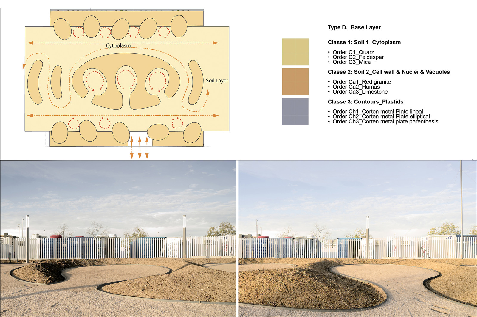 Porous base materials_ Cytoplasm. Compacted red soil acts as a granular fluid. The pavements are porous using materials such as limestone, crushed red granite, quartz, feldspar, mica, and they are compacted following the contours of the terrain. On the underground galleries belonging to the previous unfinished City of Justice project, a part of the landscape intervention has required additional layers such as waterproofing, vapor barriers, drainage, and other elements typical of green roofs. To guarantee the compactness of the discharges, it has been necessary to carry out cleaning operations to remove the disintegrated and non-compacted soils.