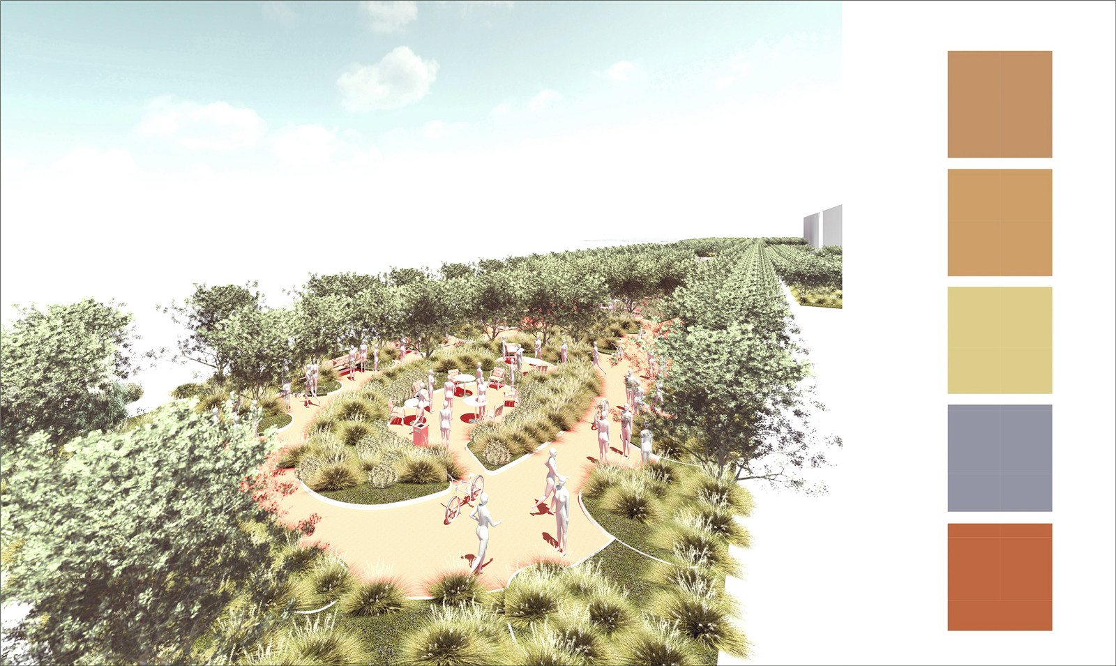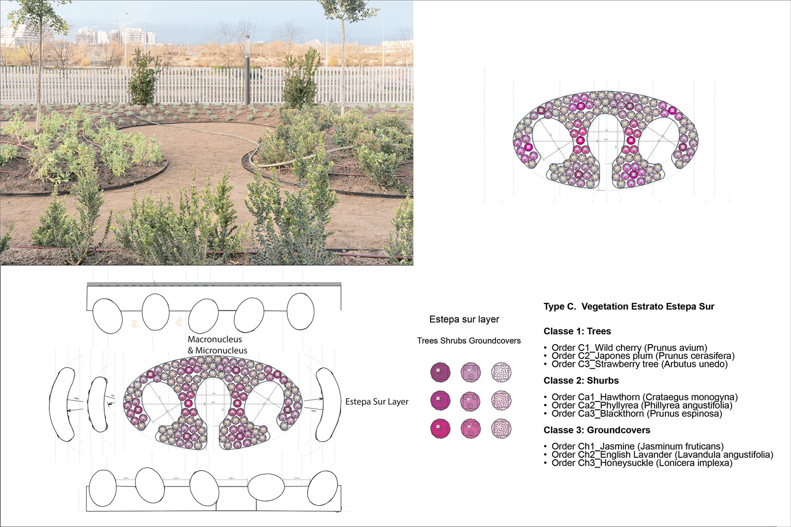 Meeting point_Nucleus DNA. Surrounded by fruit trees, aromatic shrubs, and groundcovers that do not cause respiratory problems or allergies, family units can be brought together into these outdoor waiting rooms that will house benches, chairs, and support tables in the future. The soft landscape takes as reference the planting palette of the Estepa Sur Layer. These micro-spaces are opened to multiple uses of all ages for playing, teleworking, and resting.