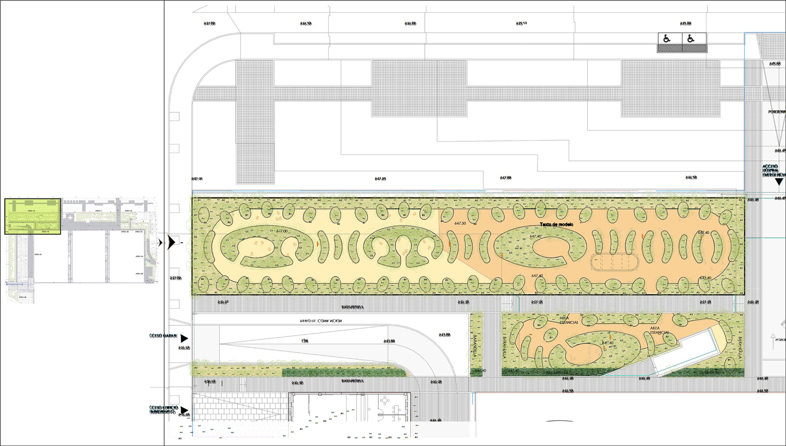 The landscape architecture project has a surface of 7,434 sqm and occupies a plot of 69,781 sqm located in the Hortaleza district of Madrid. This plot, belonging to the previous City of Justice project on the north side of the Medicina Legal building, is destinated to a public hospital constructed in 100 days during the Covid-19 pandemic. The plot is trapezoidal and has a drop of 4.5 meters.