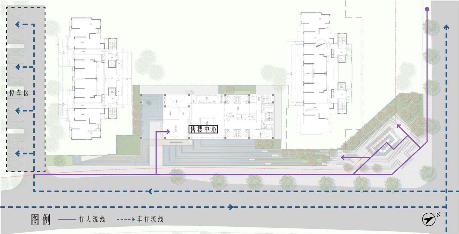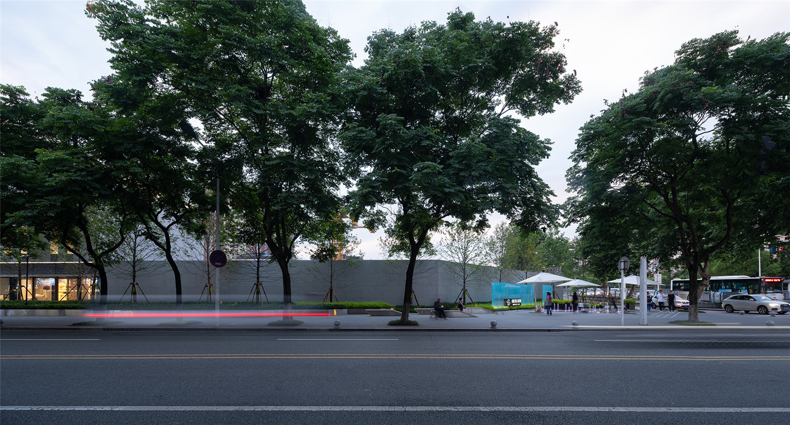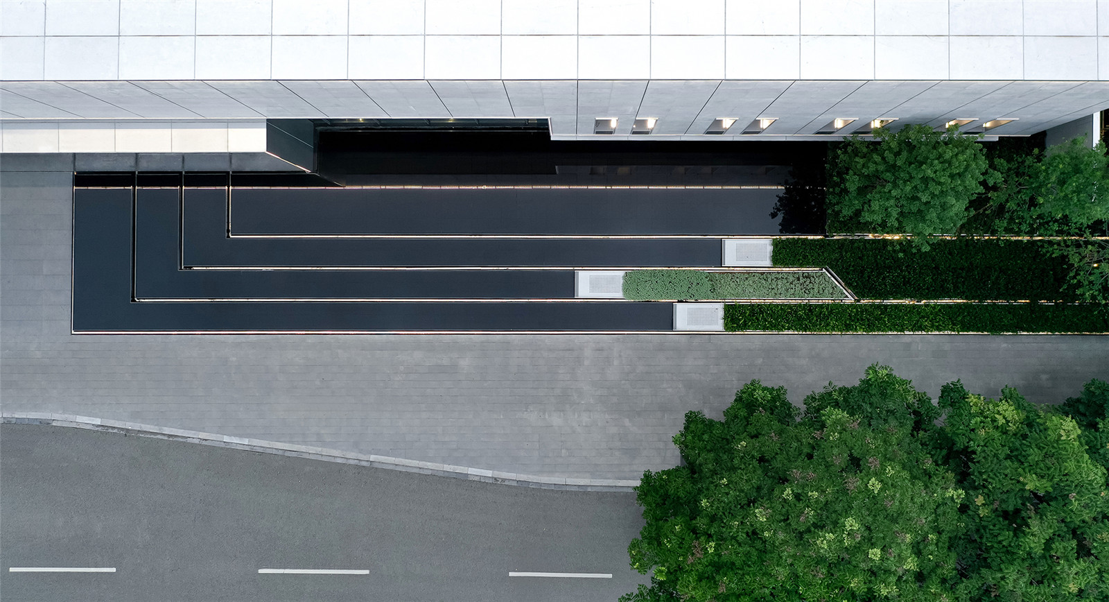 在研讀基地屬性后,我們將空間關(guān)系組織成三段式導(dǎo)引。紅線外的東北角經(jīng)過(guò)設(shè)計(jì)爭(zhēng)取后被納入場(chǎng)地,形成小型城市廣場(chǎng)空間聚合人群;東側(cè)沿街面最大化地拉寬建筑、景觀與城市街道的交融面,進(jìn)一步開放場(chǎng)地并形成線性的秩序引導(dǎo);項(xiàng)目南側(cè)被規(guī)劃為停車區(qū)域,東南側(cè)建筑主入口空間形成穿插的景觀過(guò)渡區(qū),服務(wù)于項(xiàng)目參觀人群。