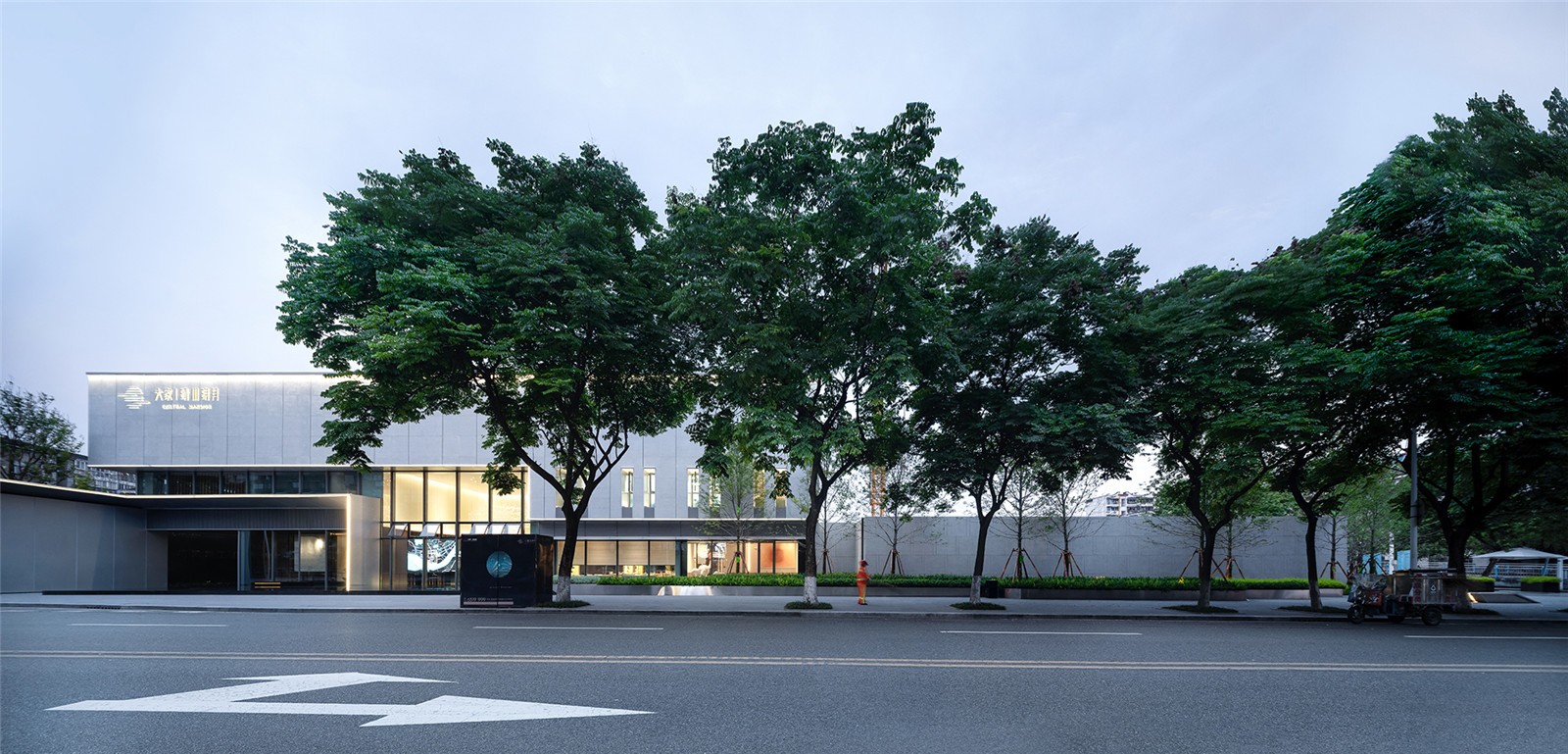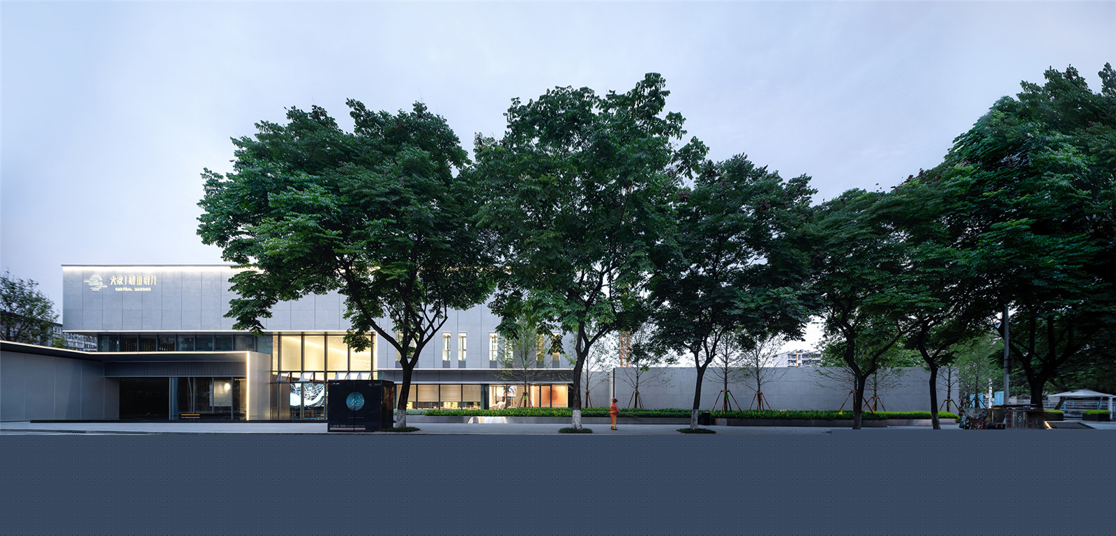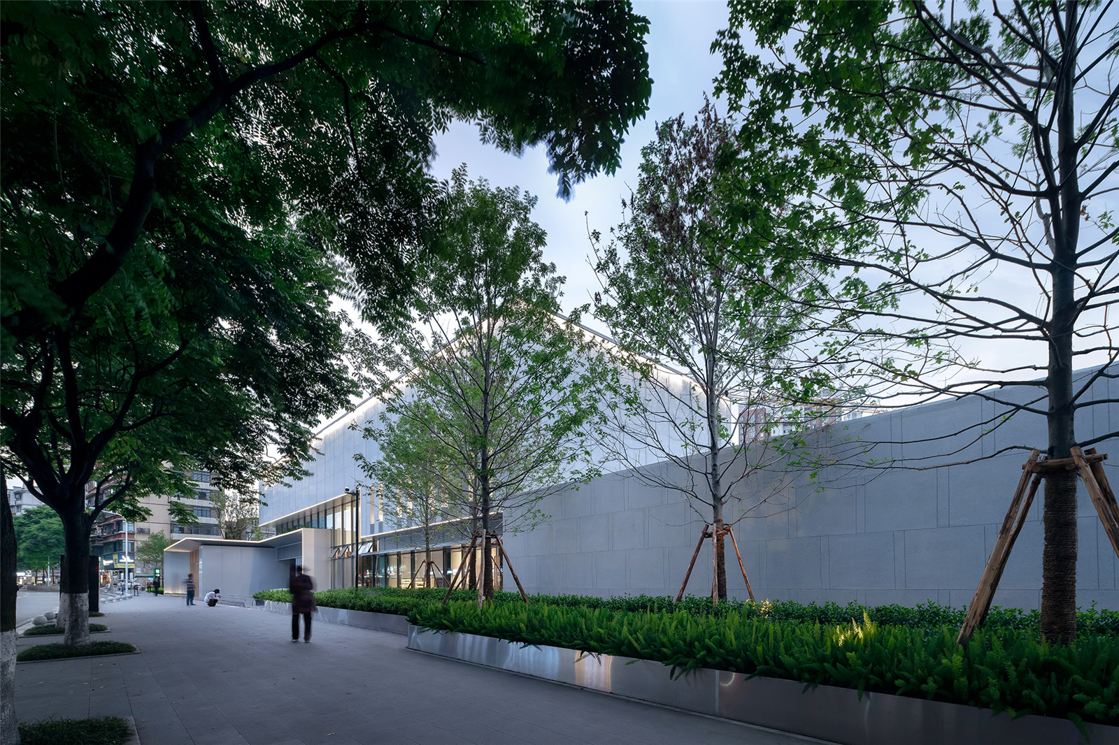 在研讀基地屬性后,我們將空間關(guān)系組織成三段式導(dǎo)引。紅線外的東北角經(jīng)過(guò)設(shè)計(jì)爭(zhēng)取后被納入場(chǎng)地,形成小型城市廣場(chǎng)空間聚合人群;東側(cè)沿街面最大化地拉寬建筑、景觀與城市街道的交融面,進(jìn)一步開放場(chǎng)地并形成線性的秩序引導(dǎo);項(xiàng)目南側(cè)被規(guī)劃為停車區(qū)域,東南側(cè)建筑主入口空間形成穿插的景觀過(guò)渡區(qū),服務(wù)于項(xiàng)目參觀人群。