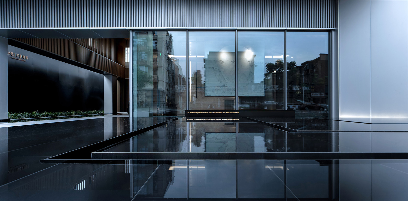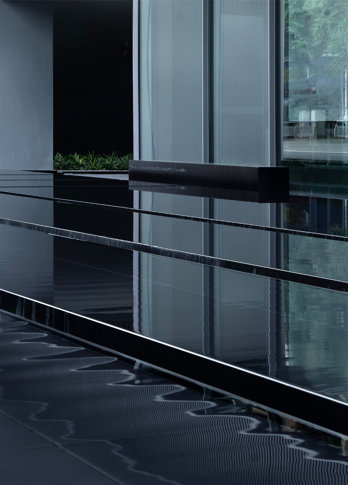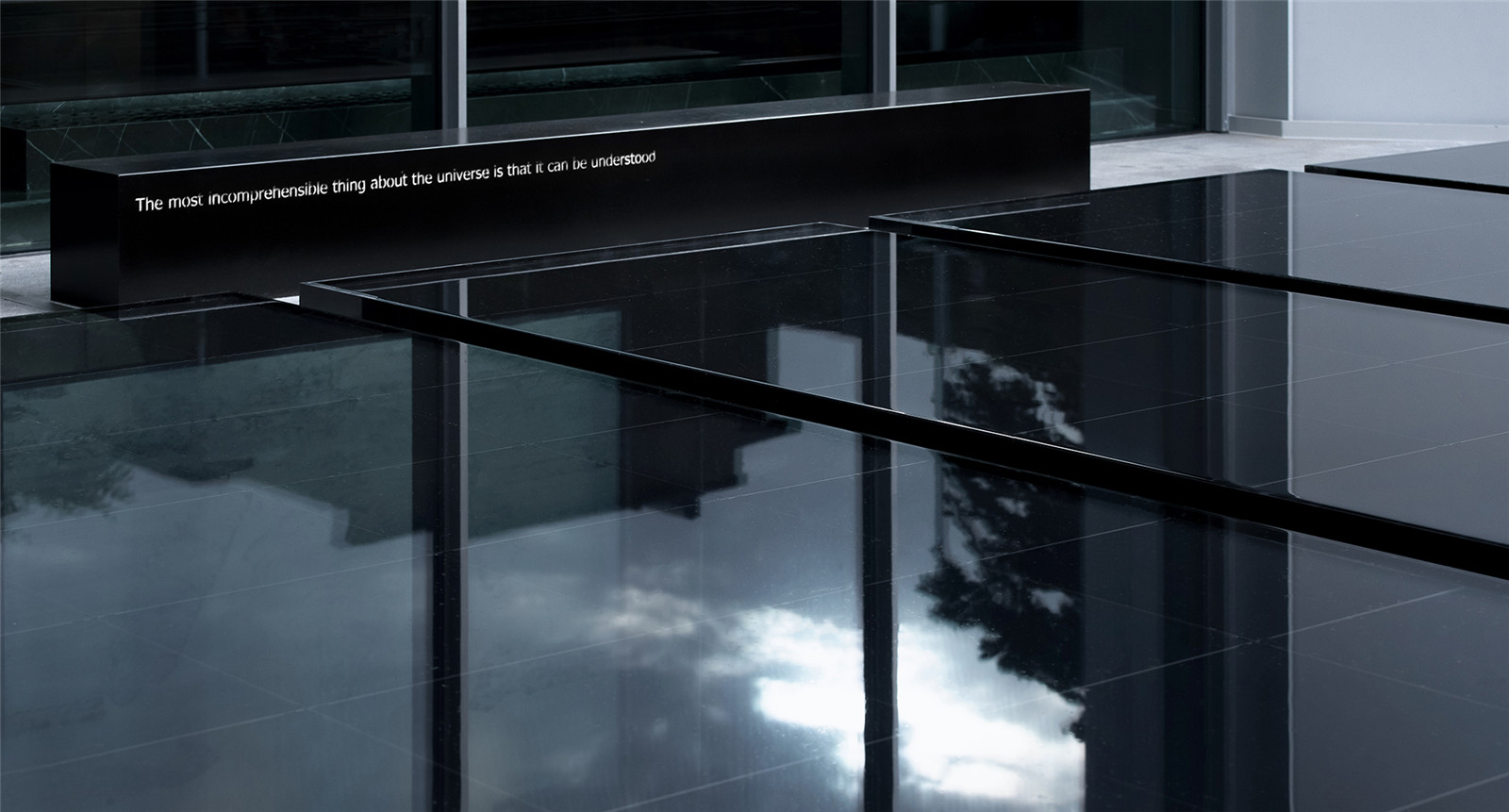 愛因斯坦的名言“The most incomprehensible thing about the world is that it is comprehensible.”鐫刻于純凈的黑色石材坐凳側(cè)壁,提示人們?cè)谶M(jìn)入建筑之前,可以選擇在這里做短暫的停留,凝視水中的天光云影,整理或放空思緒。