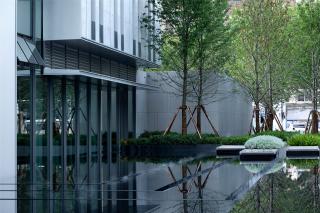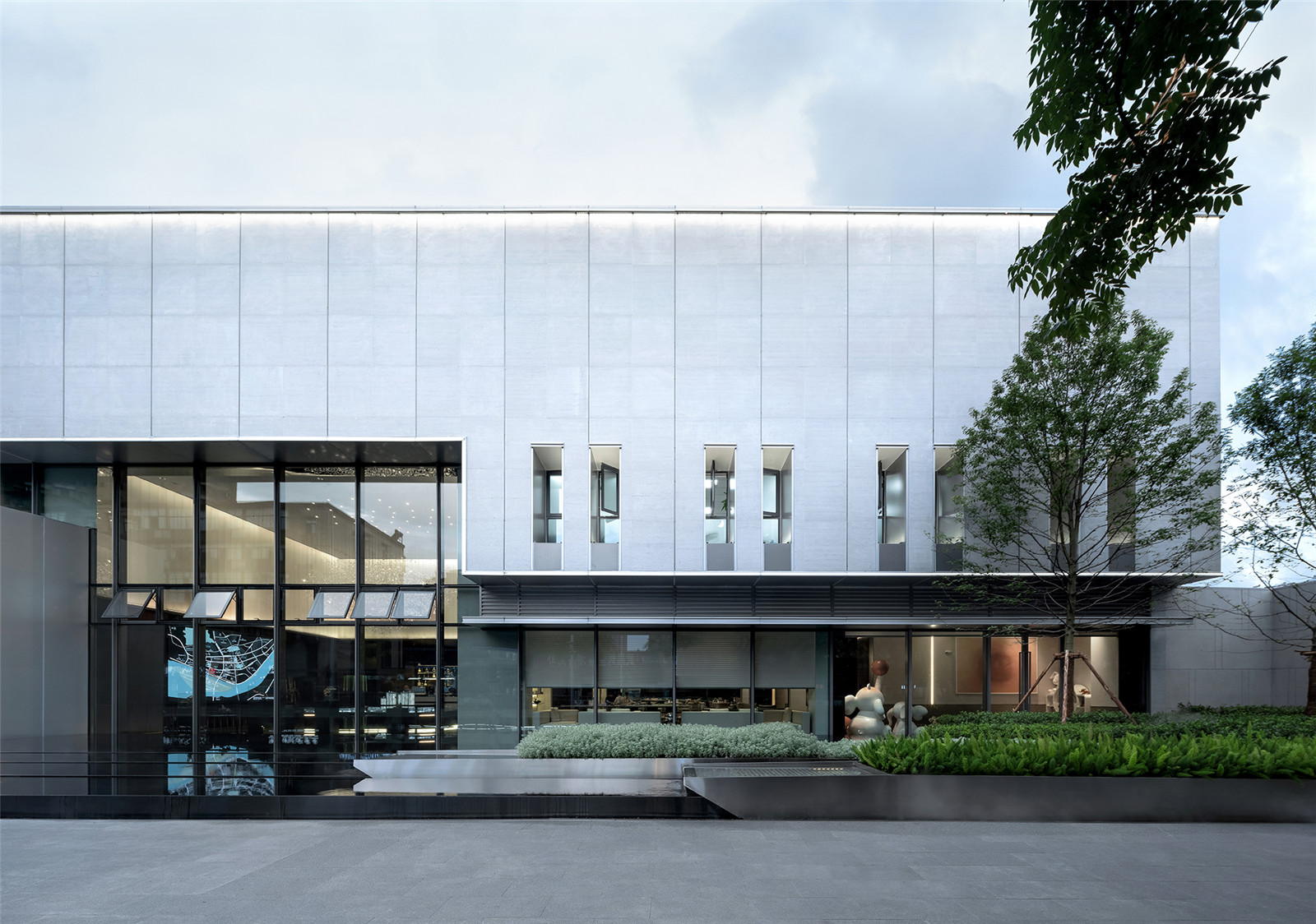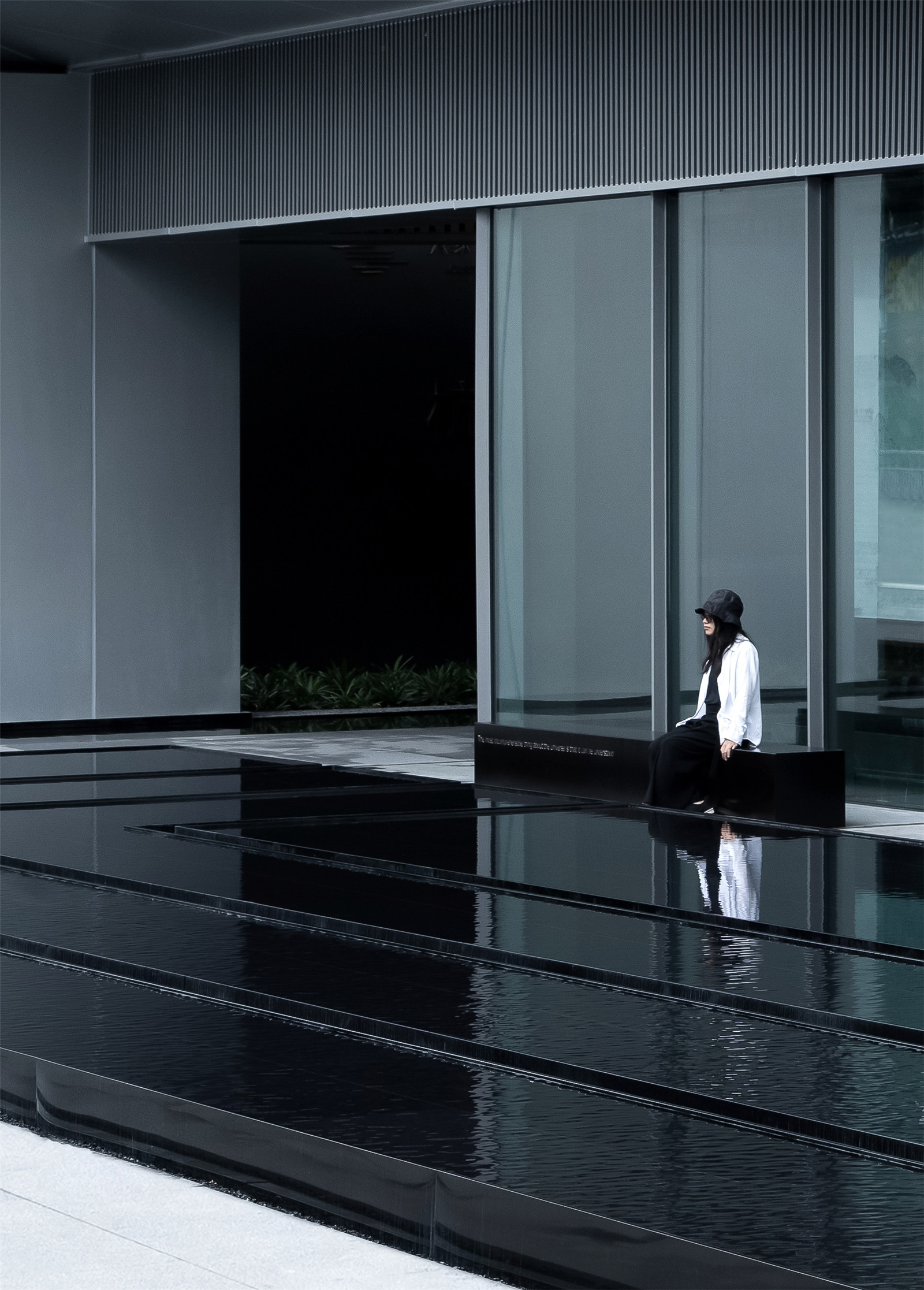 幕墻的透明性將建筑內(nèi)部的場(chǎng)景帶到了街道之上,而線性反射水景則將城市街道的剪影也納入場(chǎng)所之中,在這里,設(shè)計(jì)如同一個(gè)銜接和映射,將新與舊,過(guò)往與當(dāng)下融合在一個(gè)全新的空間之中。