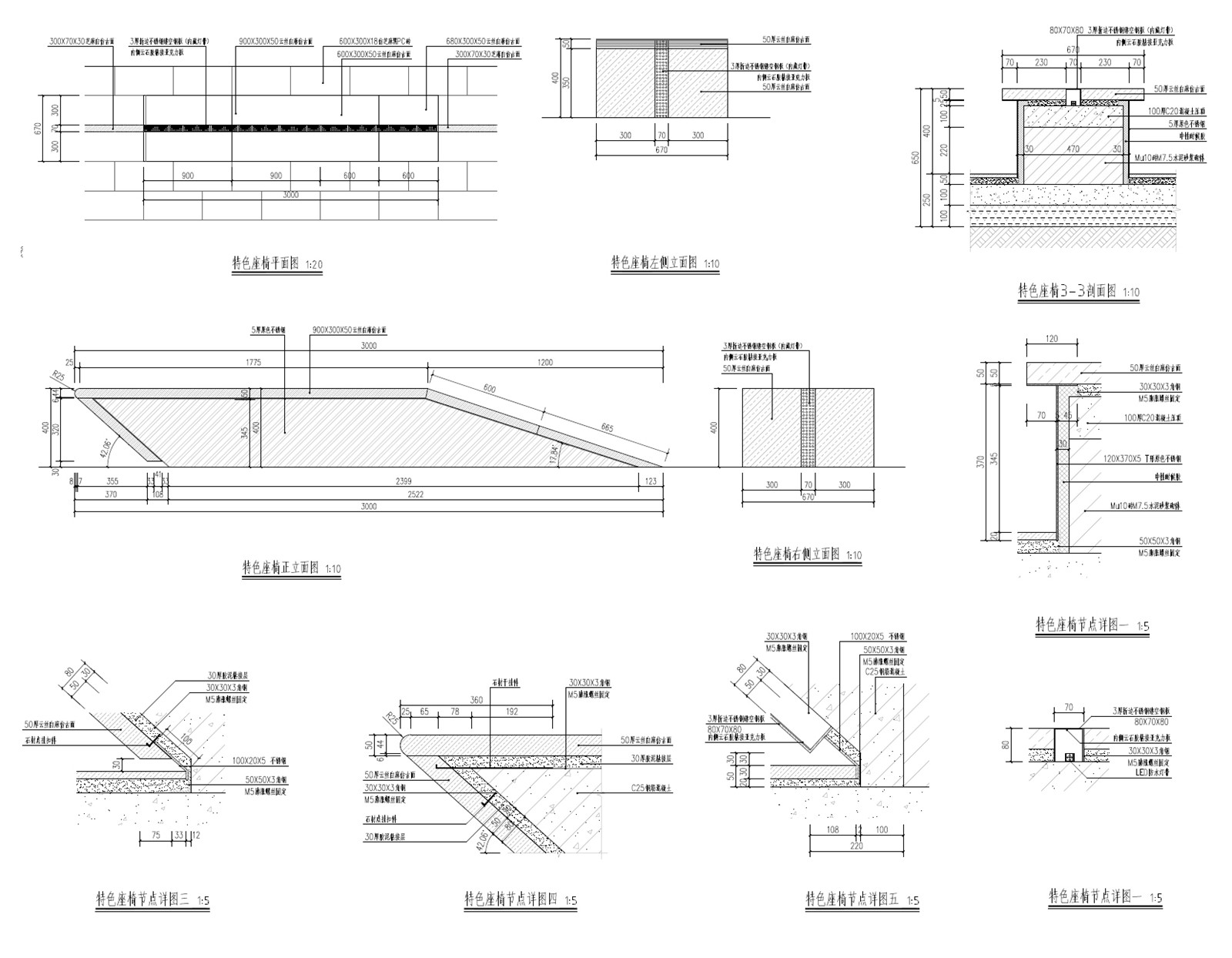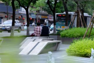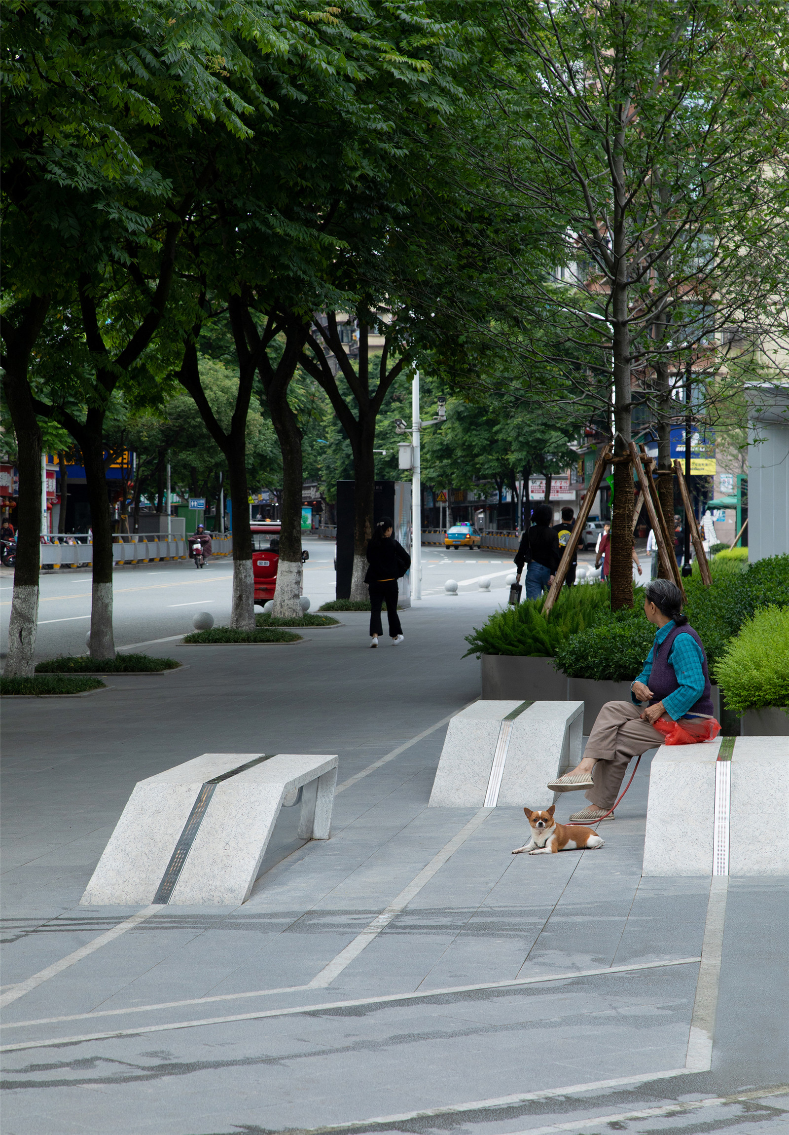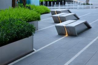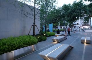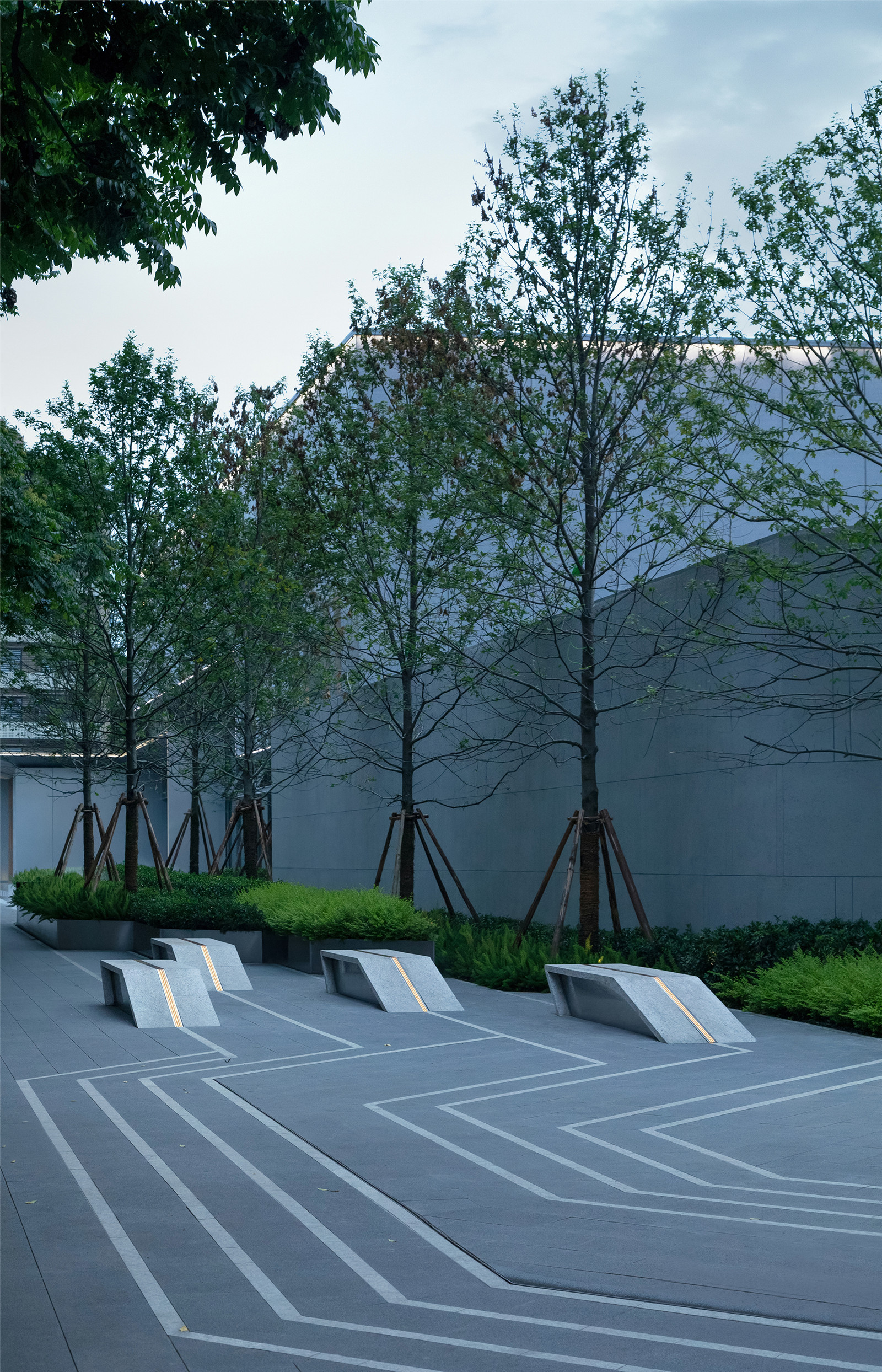 線性鋪裝細(xì)節(jié)將行人視線繼續(xù)向南側(cè)引導(dǎo),如同積蓄的勢(shì)能無(wú)可抵擋的傳遞,順勢(shì)拱起的座椅是進(jìn)入下一景觀段落的標(biāo)記,更為城市空間提供了停留的條件,與鋪裝線條同寬的線性燈帶點(diǎn)亮傍晚的街角。