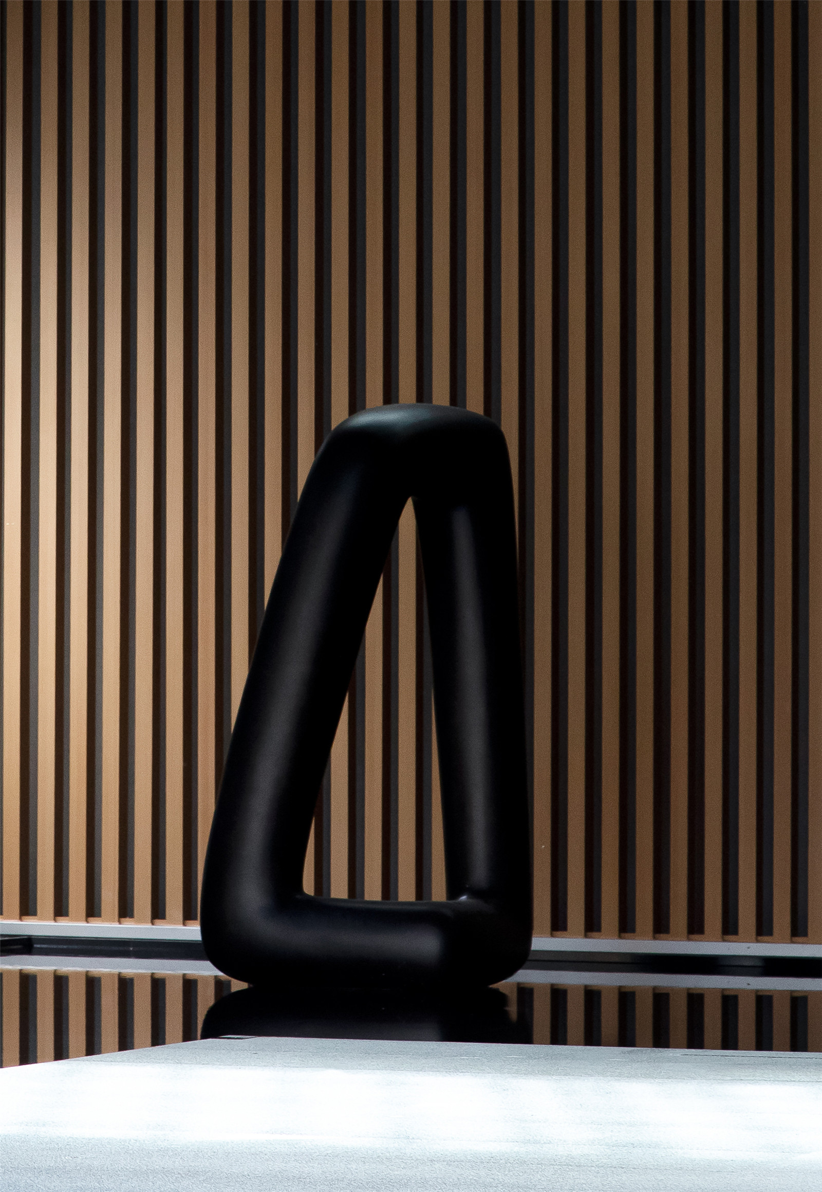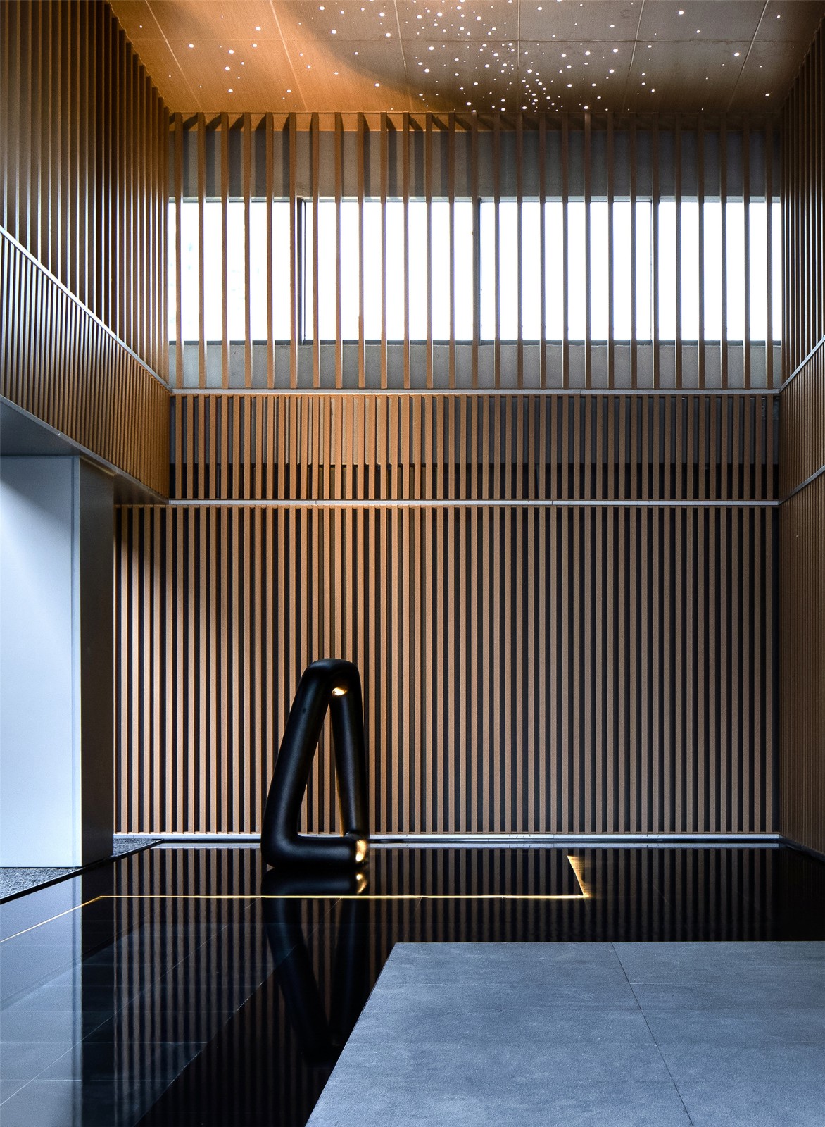 在星空吊頂之下,水底立體的設(shè)計(jì)保留了最后一道光束,圍繞著一個(gè)扭轉(zhuǎn)形體的純黑色石材雕塑,靜默地佇立于水面之上。至此,貫穿場(chǎng)地始終的能量之旅經(jīng)過(guò)開啟、傳遞、積蓄、轉(zhuǎn)折的過(guò)程,最終以一個(gè)強(qiáng)有力的形象結(jié)束,而黑色雕塑自身無(wú)限可循環(huán)的形式隱喻這終結(jié)只是暫時(shí),能量在自然界永不消散。