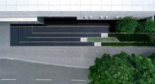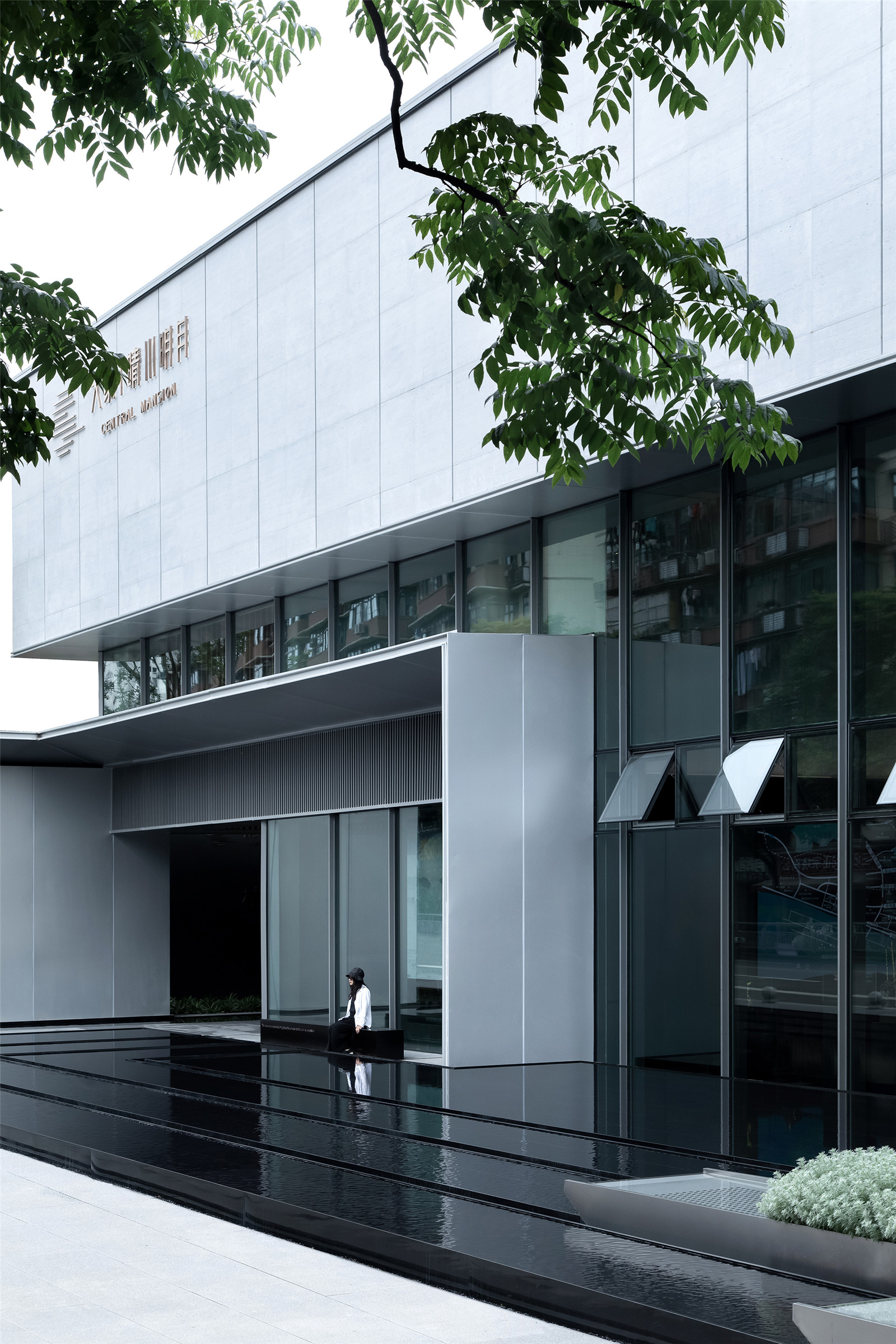 建筑主入口謙虛地藏于灰空間之后,為景觀繼續(xù)延伸滲透提供了條件。寬闊的鋪裝昭示了進(jìn)入的通道,高出地面的線形水景結(jié)束于通道右側(cè),而左側(cè)的低水面則繼續(xù)承載著能量的繼續(xù)進(jìn)發(fā)。